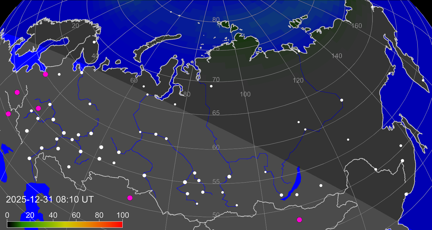 Индекс интенсивности полярных сияний и теоретически возможная широта наблюдений для ночного времени в восточном полушарии