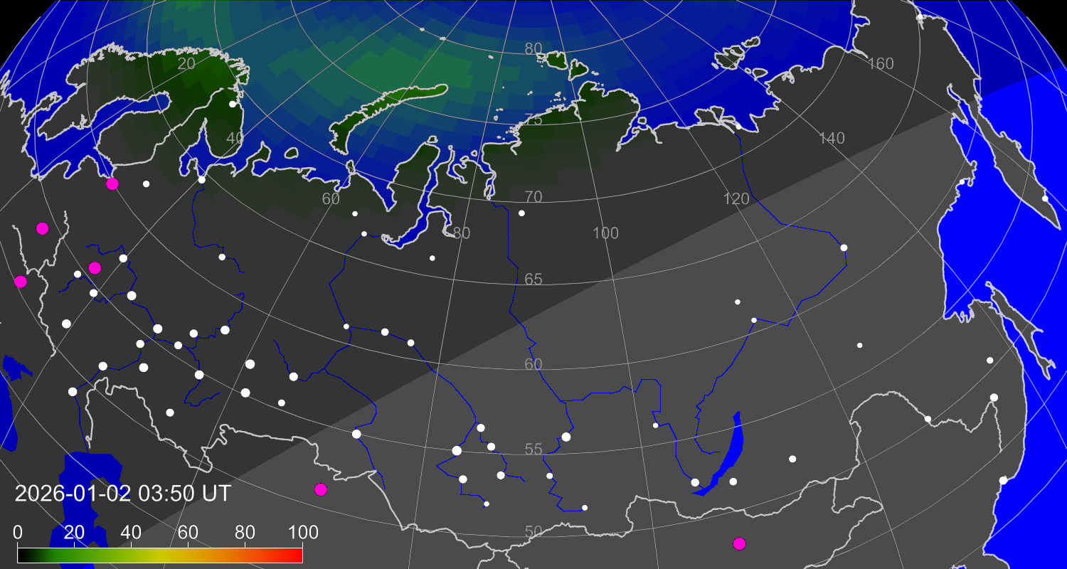 Вероятность полярных сияний в городах Российской Федерации