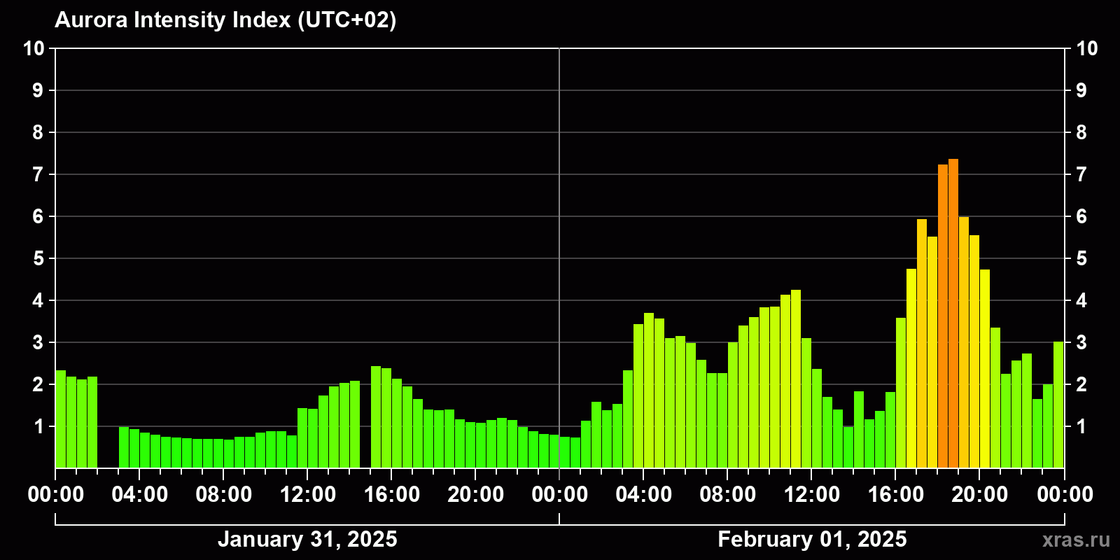 Auroral intensity index and the theoretically possible latitude of observations for nighttime in the Estern Hemisphere as of 2025-02-01 23:45 (end of day) local time