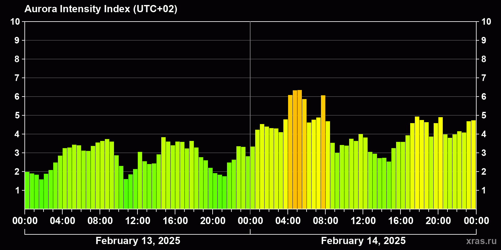 Changes in the auroral intensity index from 2025-02-13 to 2025-02-14 local time