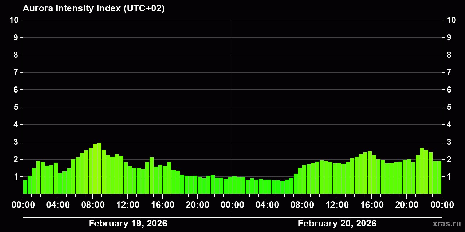 Changes in the auroral intensity index from 2026-02-19 to 2026-02-20 local time