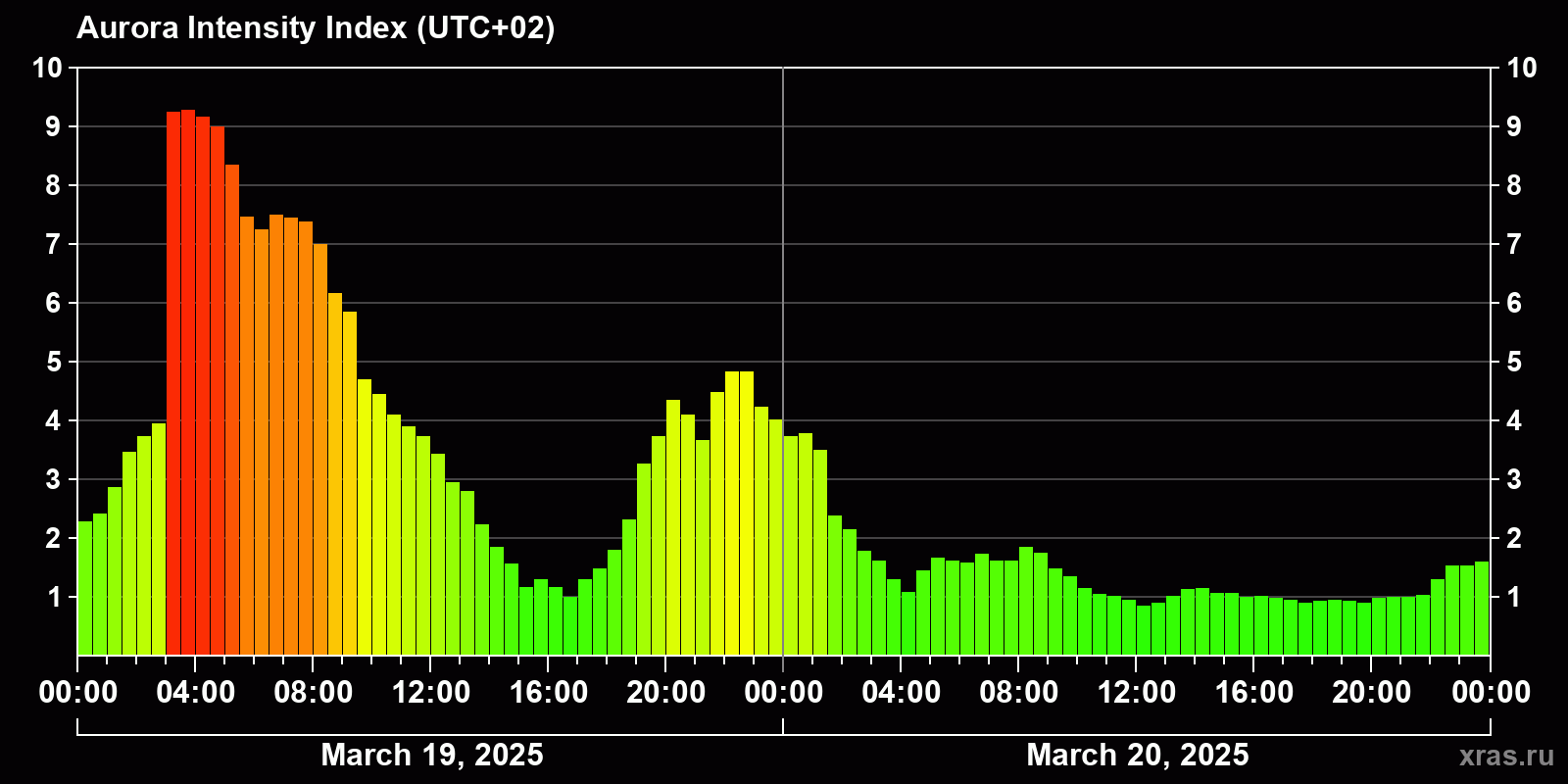Changes in the auroral intensity index from 2025-03-19 to 2025-03-20 local time