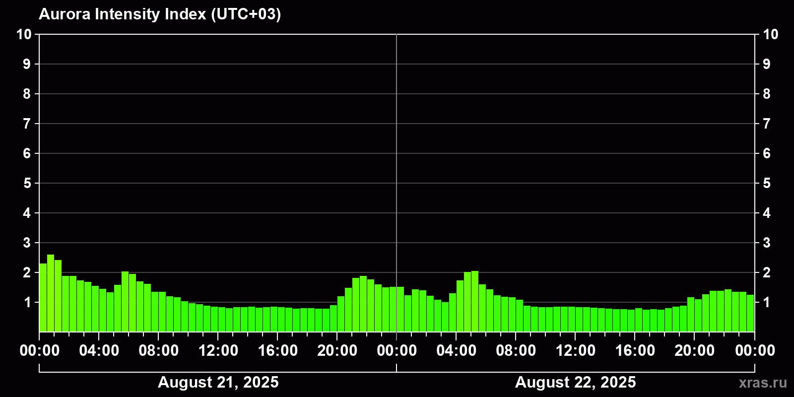 Auroral intensity index and the theoretically possible latitude of observations for nighttime in the Estern Hemisphere as of 2025-08-22 23:48 (end of day) local time