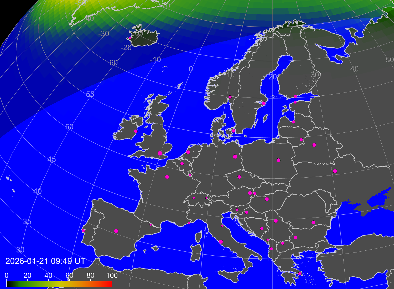 Индекс интенсивности полярных сияний и теоретически возможная широта наблюдений для ночного времени в восточном полушарии