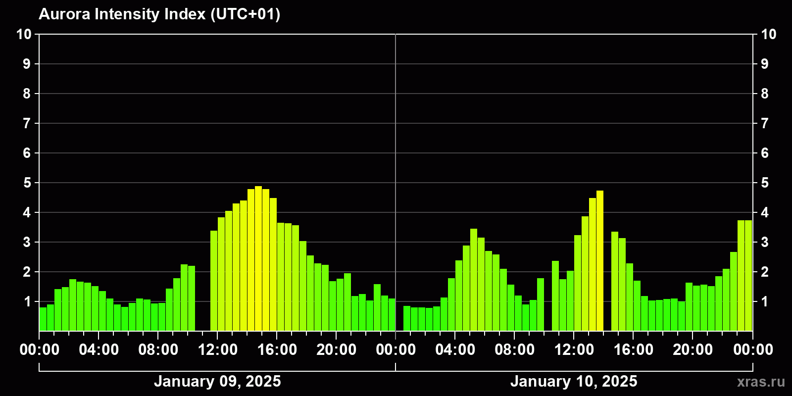 Auroral intensity index and the theoretically possible latitude of observations for nighttime in the Estern Hemisphere as of 2025-01-10 23:49 (end of day) local time