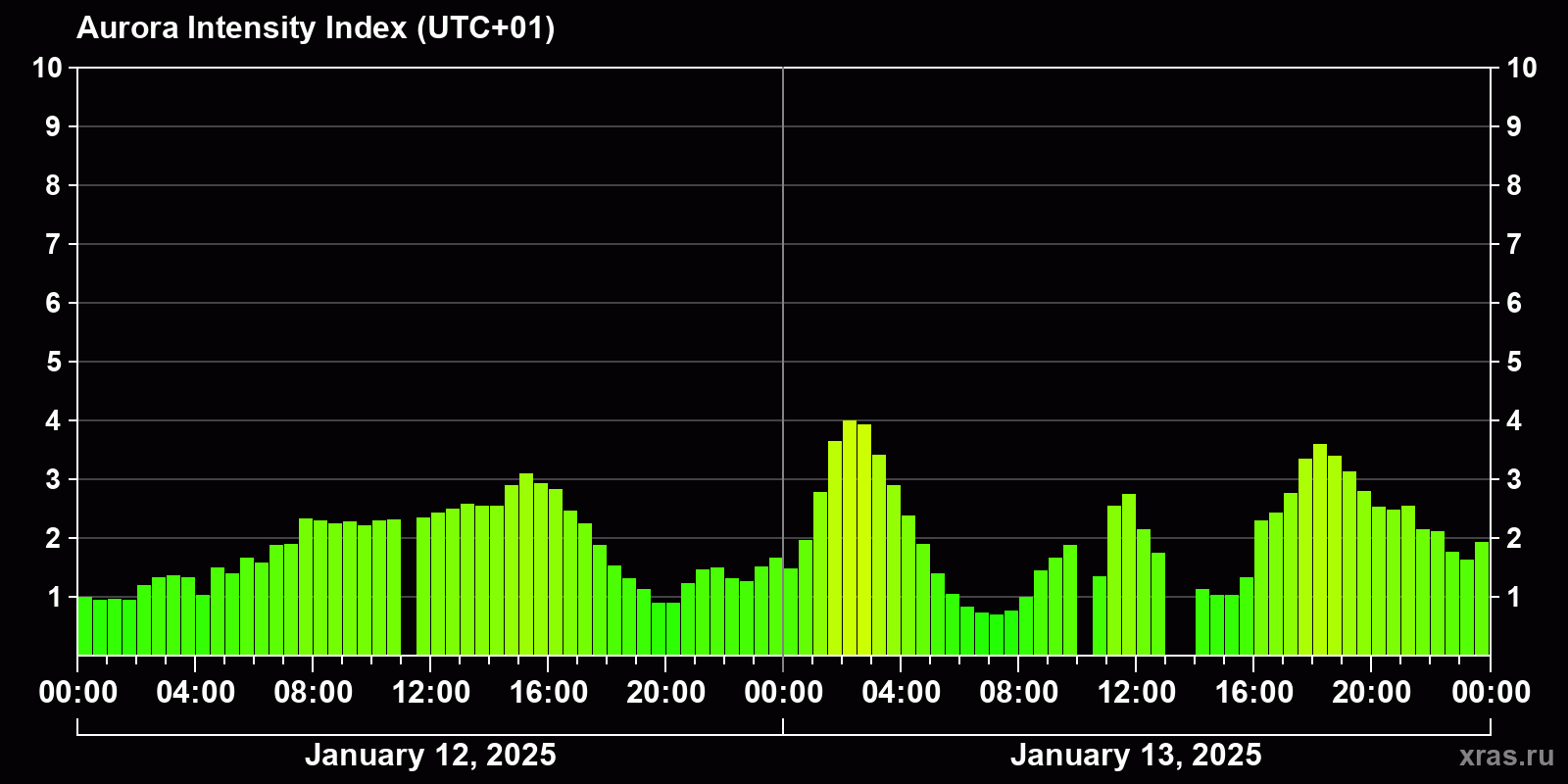Changes in the auroral intensity index from 2025-01-12 to 2025-01-13 local time