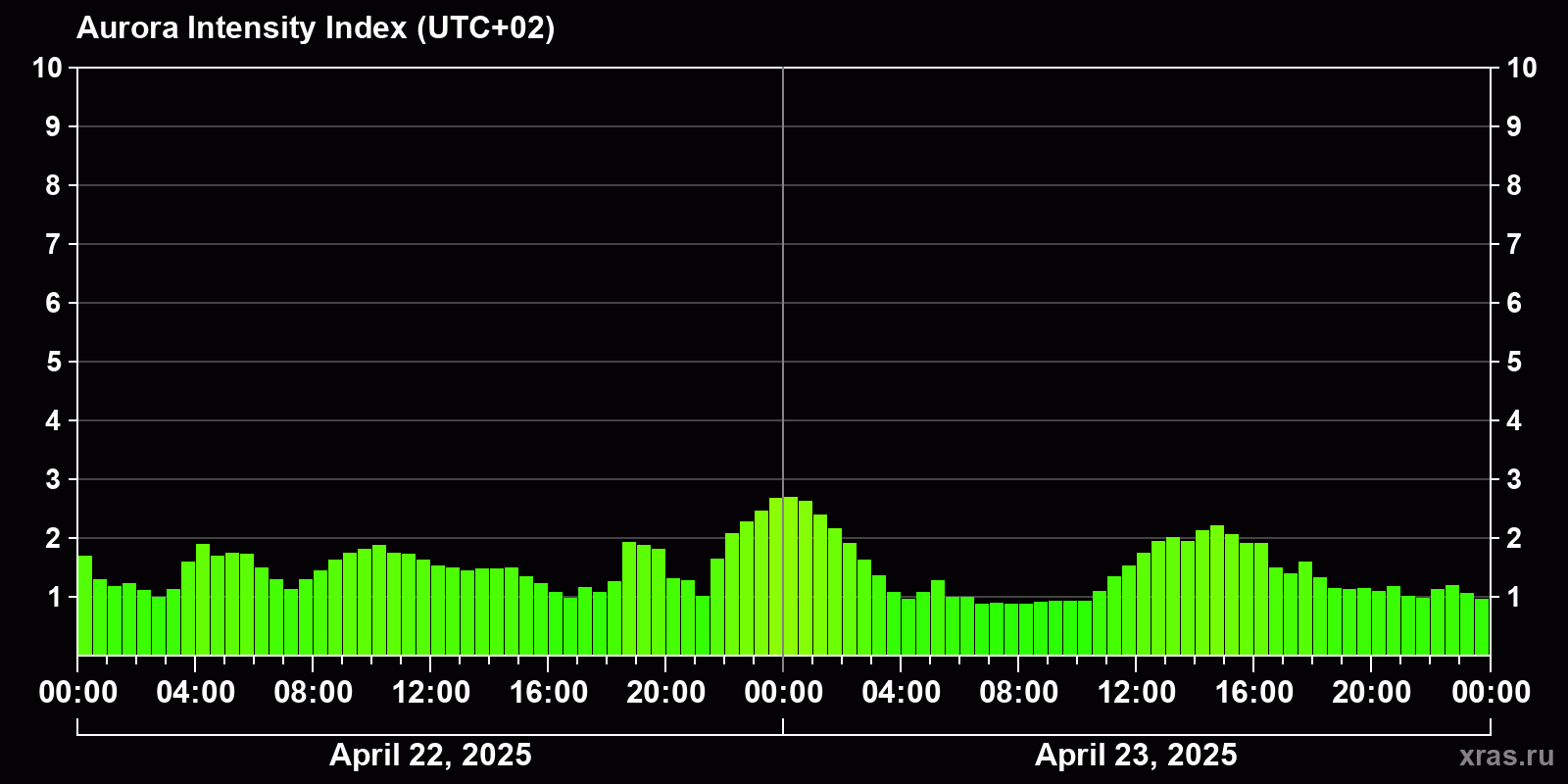 Changes in the auroral intensity index from 2025-04-22 to 2025-04-23 local time