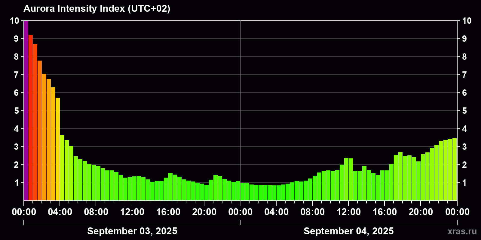 Auroral intensity index and the theoretically possible latitude of observations for nighttime in the Estern Hemisphere as of 2025-09-04 23:52 (end of day) local time