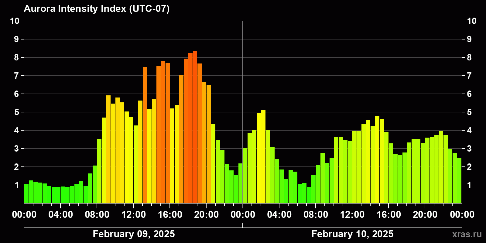 Changes in the auroral intensity index from 2025-02-09 to 2025-02-10 local time