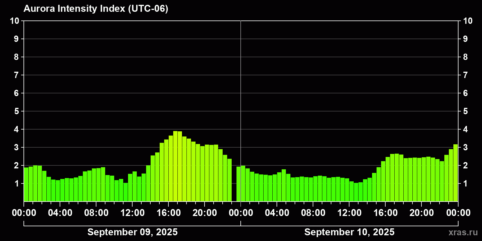Auroral intensity index and the theoretically possible latitude of observations for nighttime in the Western Hemisphere as of 2025-09-10 23:49 (end of day) local time