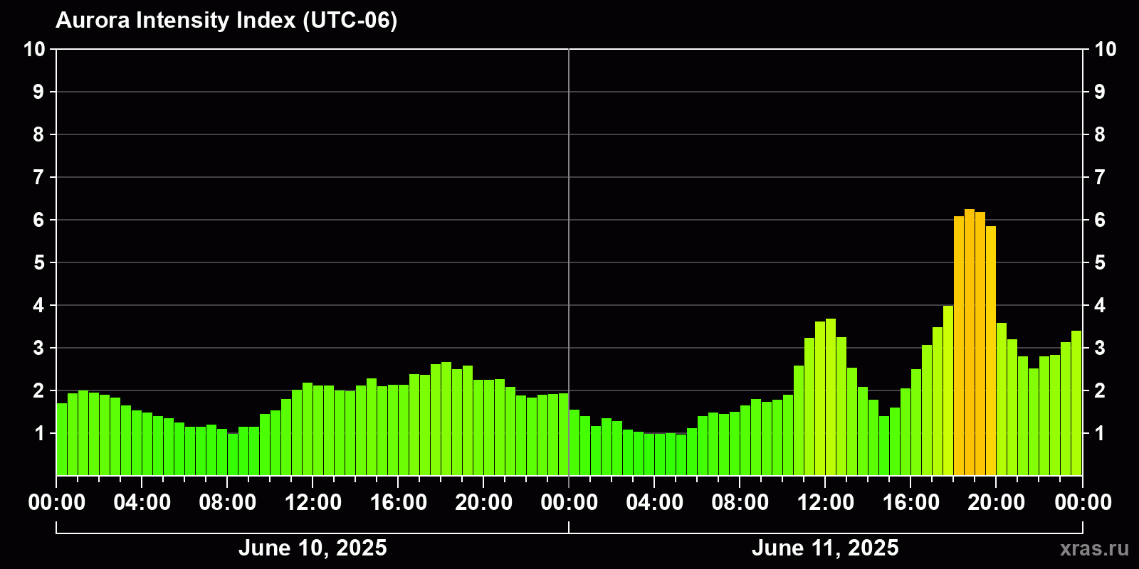 Auroral intensity index and the theoretically possible latitude of observations for nighttime in the Western Hemisphere as of 2025-06-11 23:58 (end of day) local time