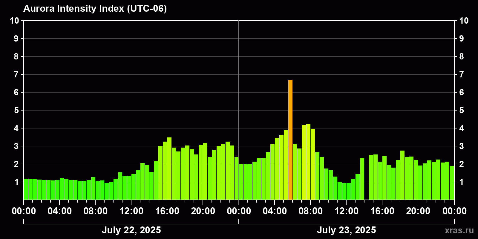 Auroral intensity index and the theoretically possible latitude of observations for nighttime in the Western Hemisphere as of 2025-07-23 23:47 (end of day) local time