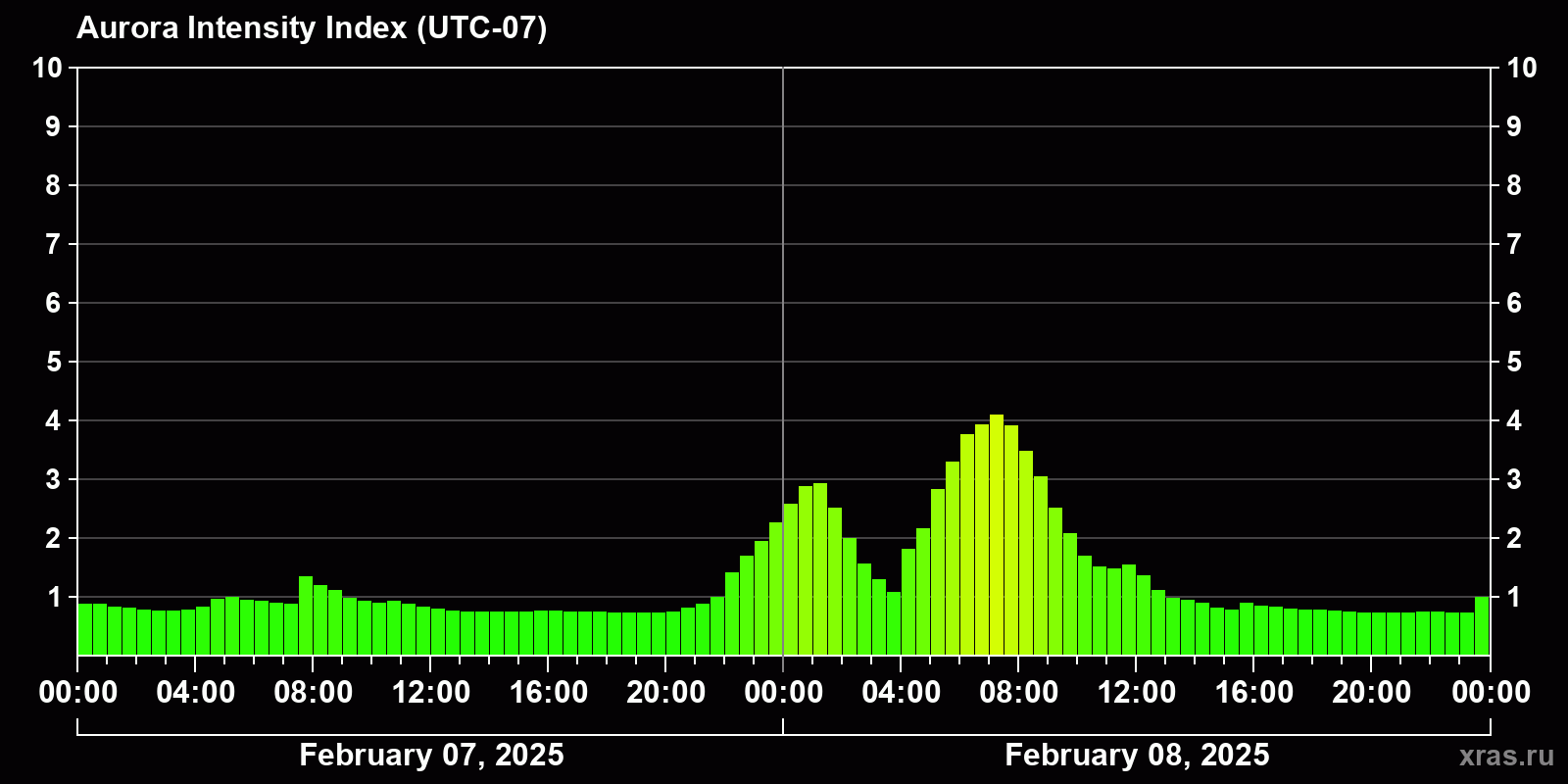 Changes in the auroral intensity index from 2025-02-07 to 2025-02-08 local time