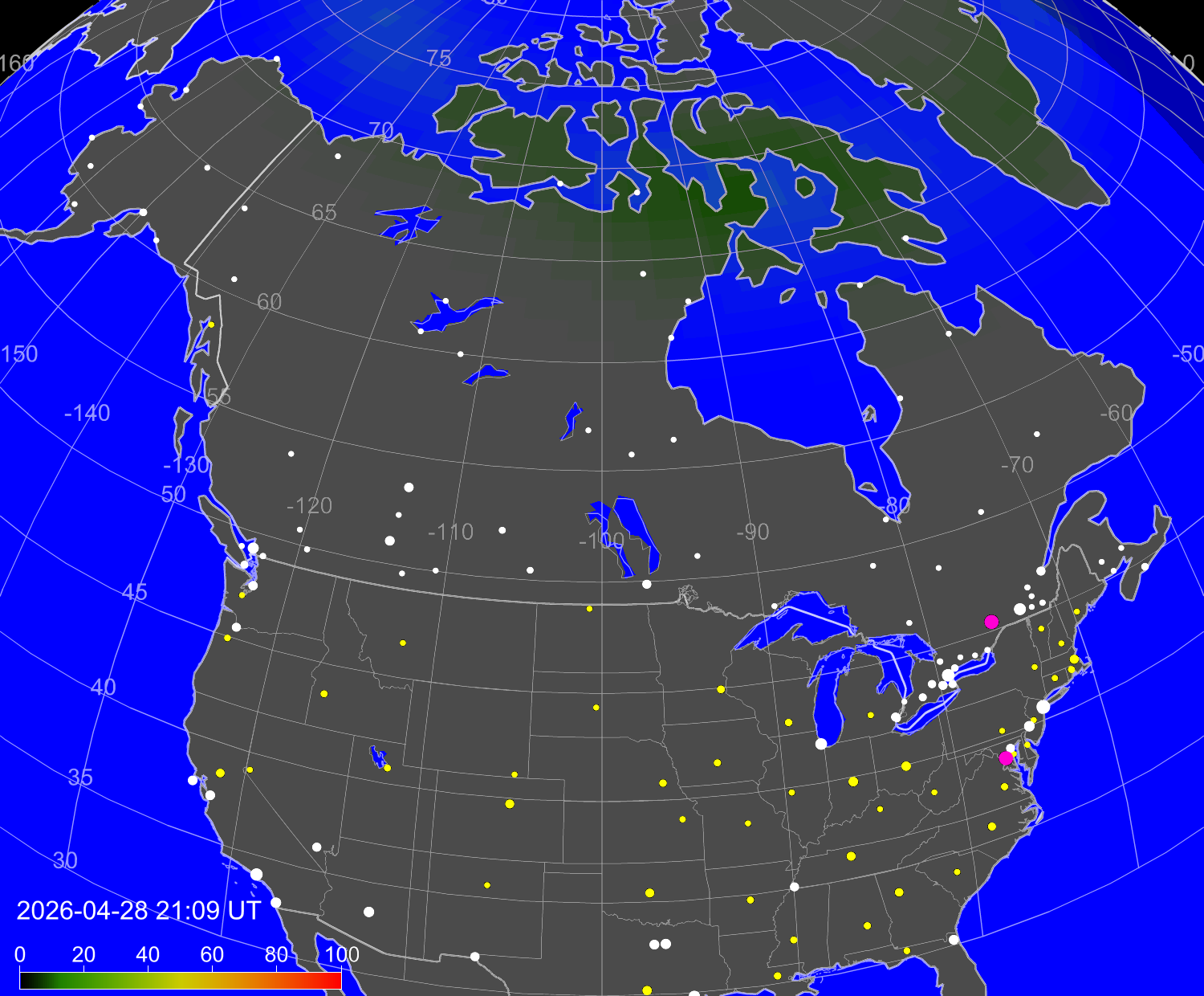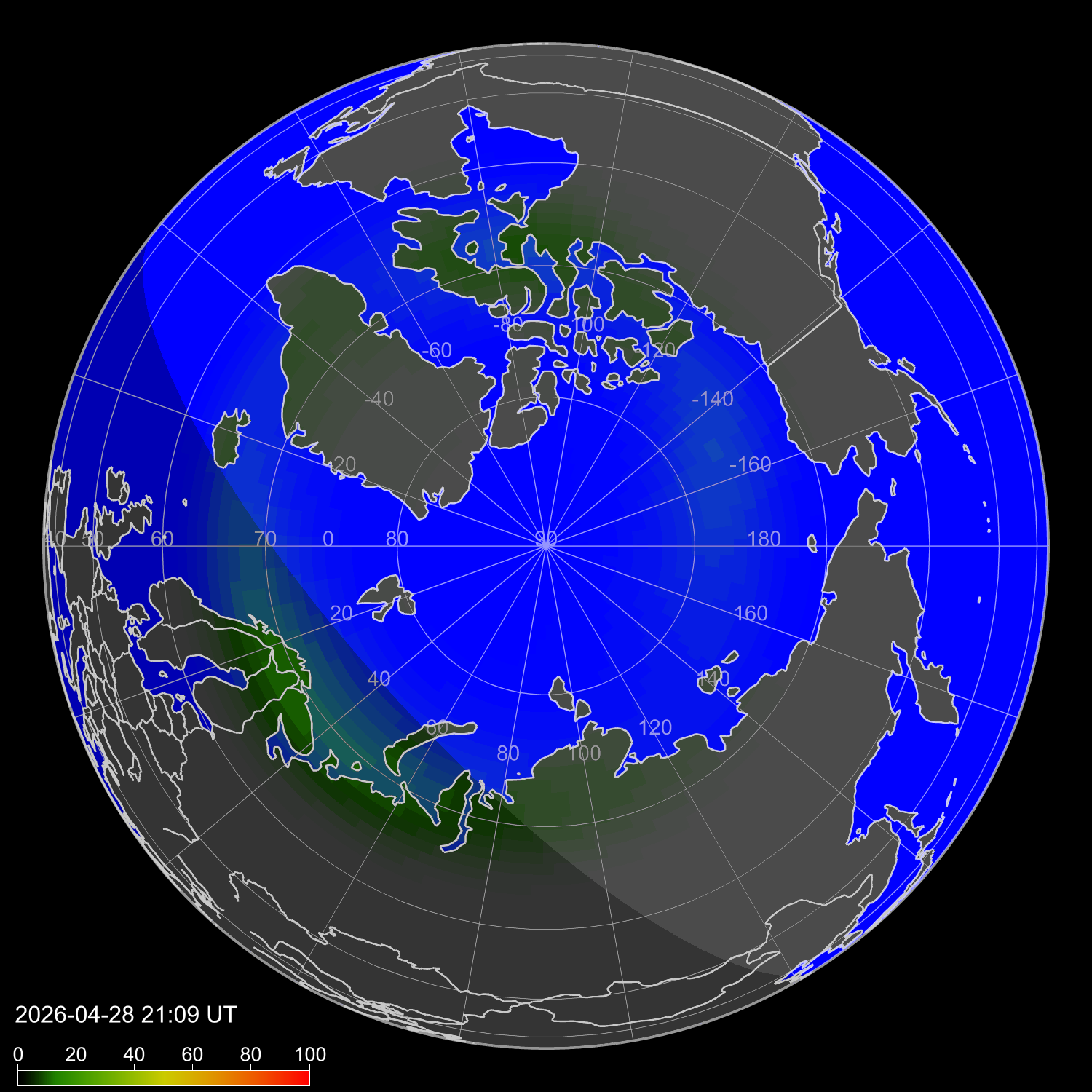 Auroral intensity index and theoretically possible latitude of observations for nighttime in the Western Hemisphere