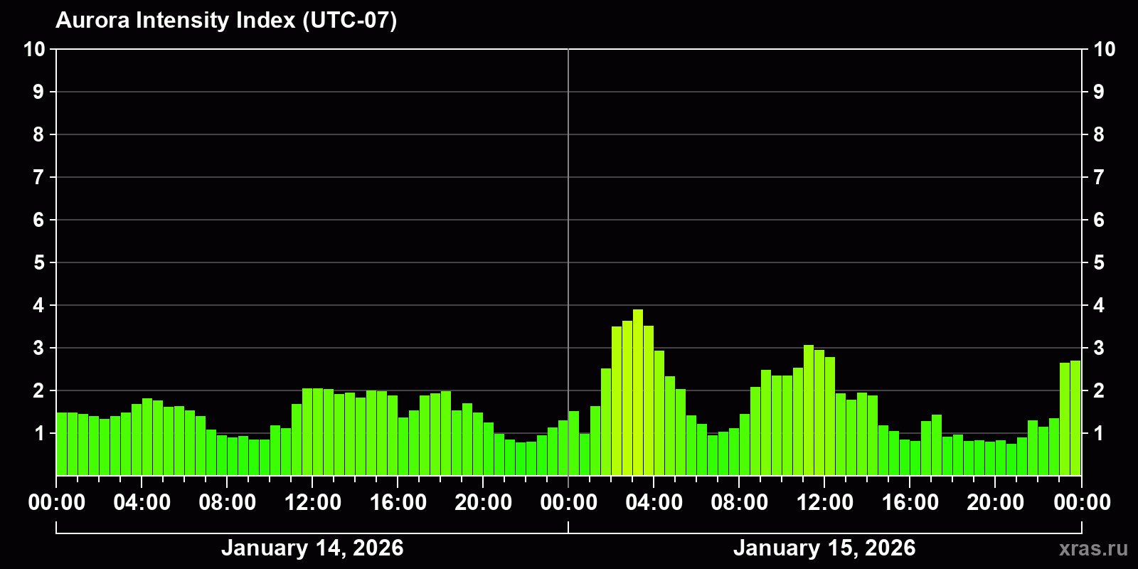 Changes in the auroral intensity index from 2026-01-14 to 2026-01-15 local time
