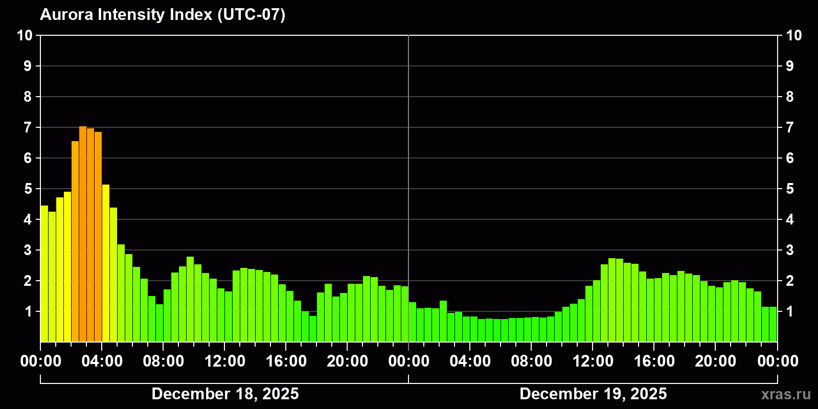 Auroral intensity index and the theoretically possible latitude of observations for nighttime in the Western Hemisphere as of 2025-12-19 23:58 (end of day) local time