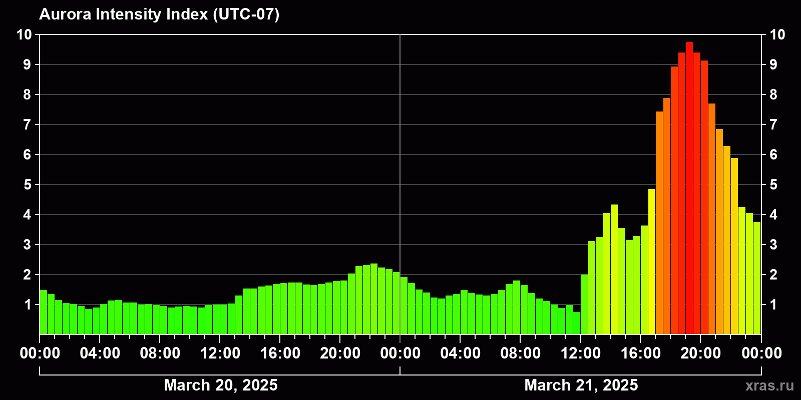 Changes in the auroral intensity index from 2025-03-20 to 2025-03-21 local time