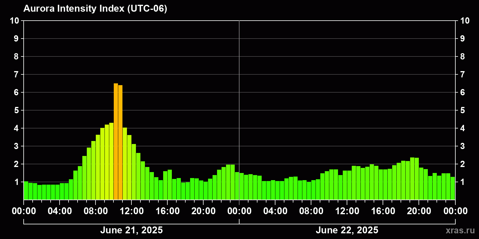 Auroral intensity index and the theoretically possible latitude of observations for nighttime in the Western Hemisphere as of 2025-06-22 23:54 (end of day) local time