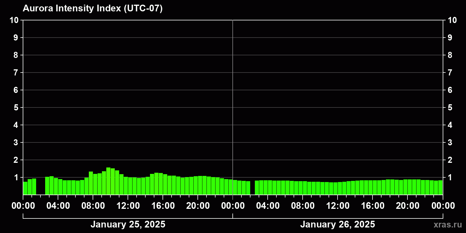 Auroral intensity index and the theoretically possible latitude of observations for nighttime in the Western Hemisphere as of 2025-01-26 23:49 (end of day) local time