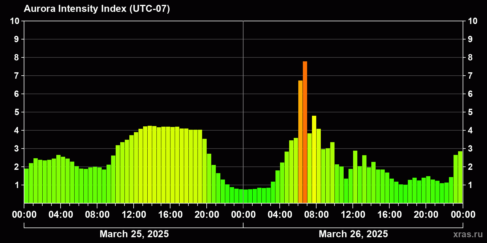 Changes in the auroral intensity index from 2025-03-25 to 2025-03-26 local time