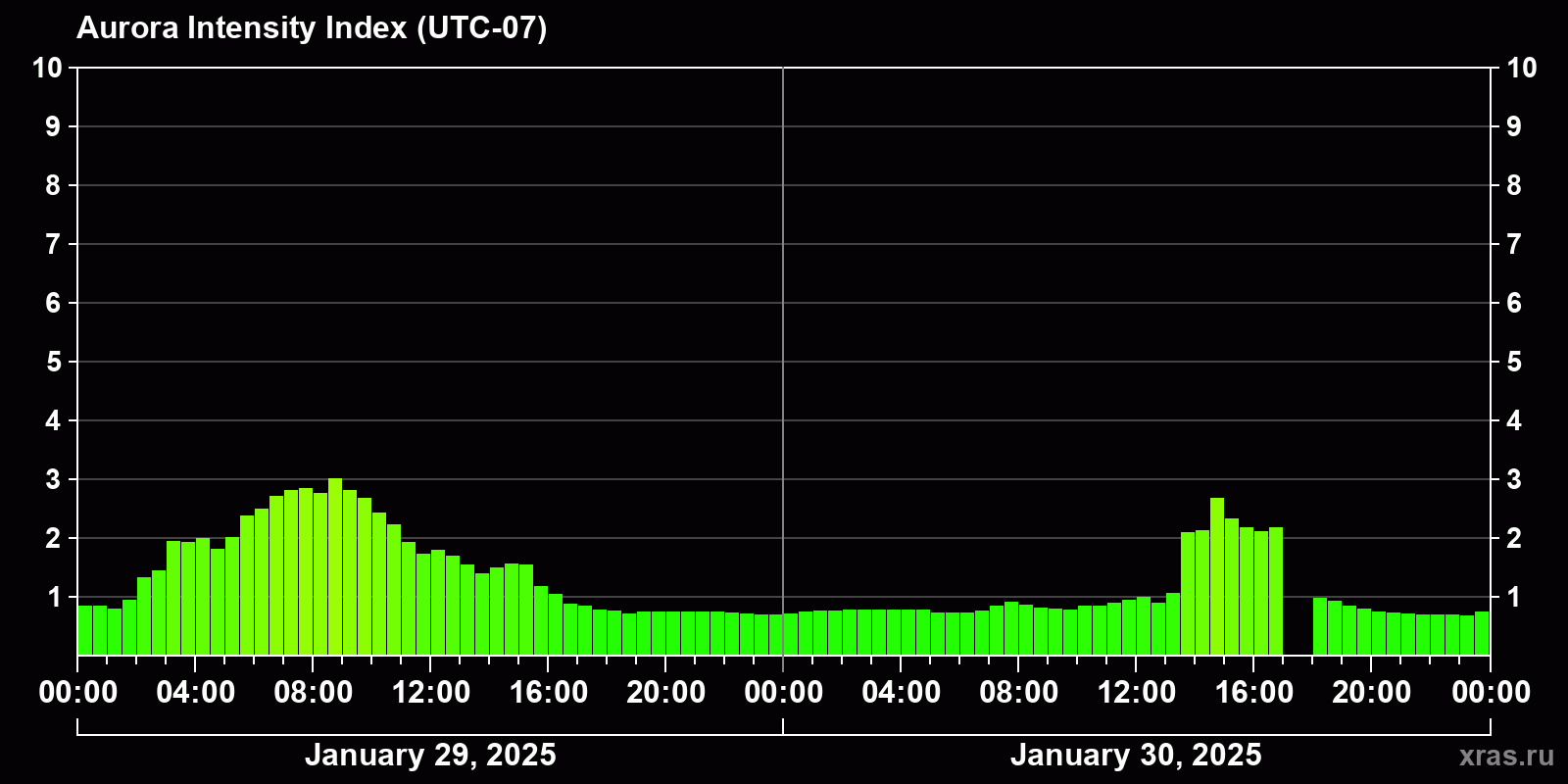 Changes in the auroral intensity index from 2025-01-29 to 2025-01-30 local time