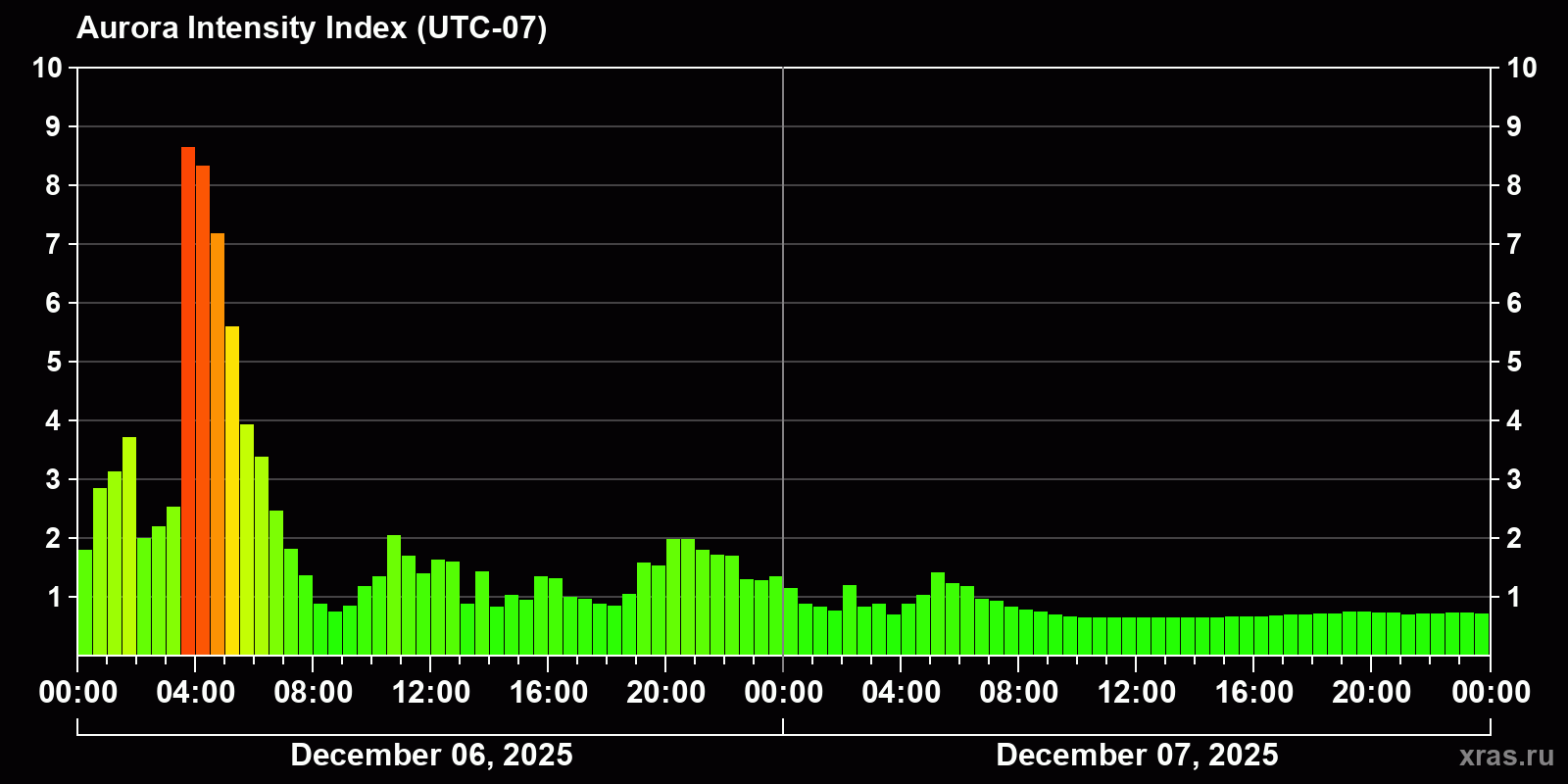 Auroral intensity index and the theoretically possible latitude of observations for nighttime in the Western Hemisphere as of 2025-12-07 23:59 (end of day) local time