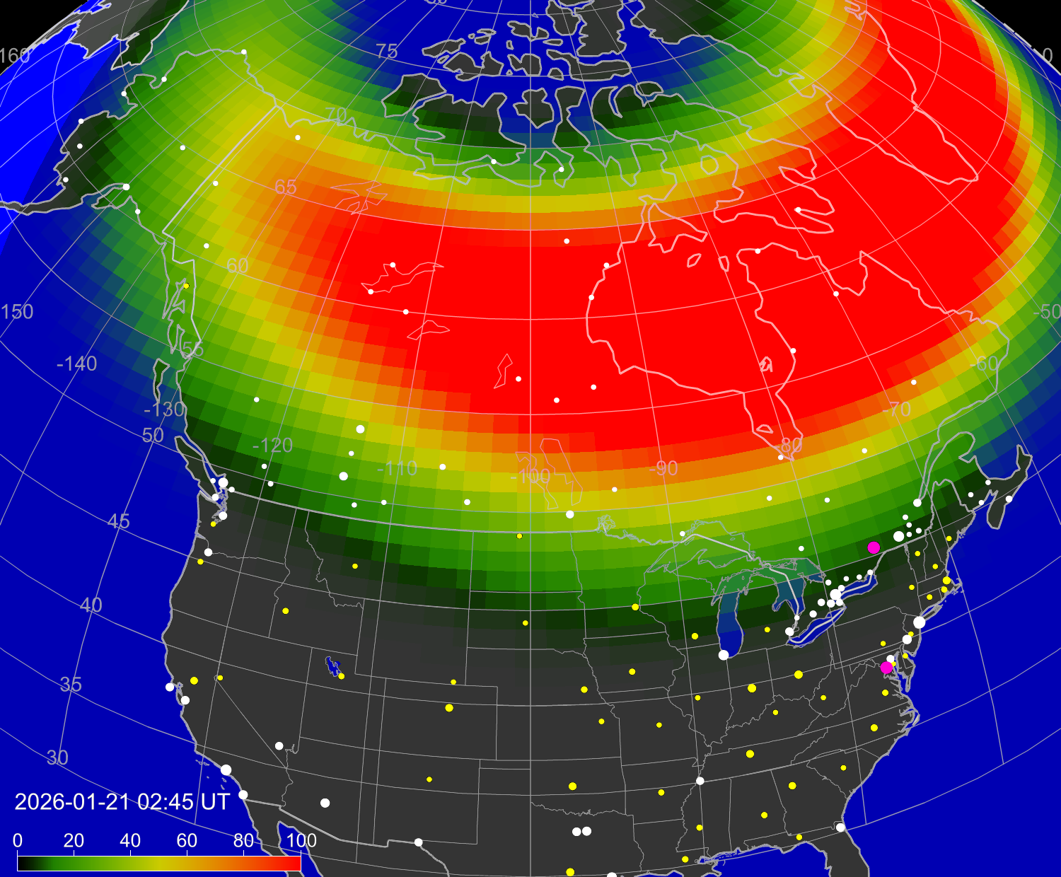 Изменения и часовой прогноз индекса интенсивности полярных сияний с 2026-01-20 по 2026-01-21