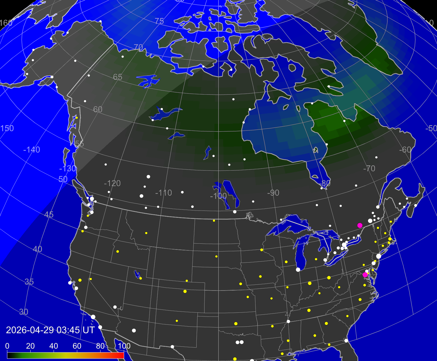 Auroral intensity index and theoretically possible latitude of observations for nighttime in the Western Hemisphere