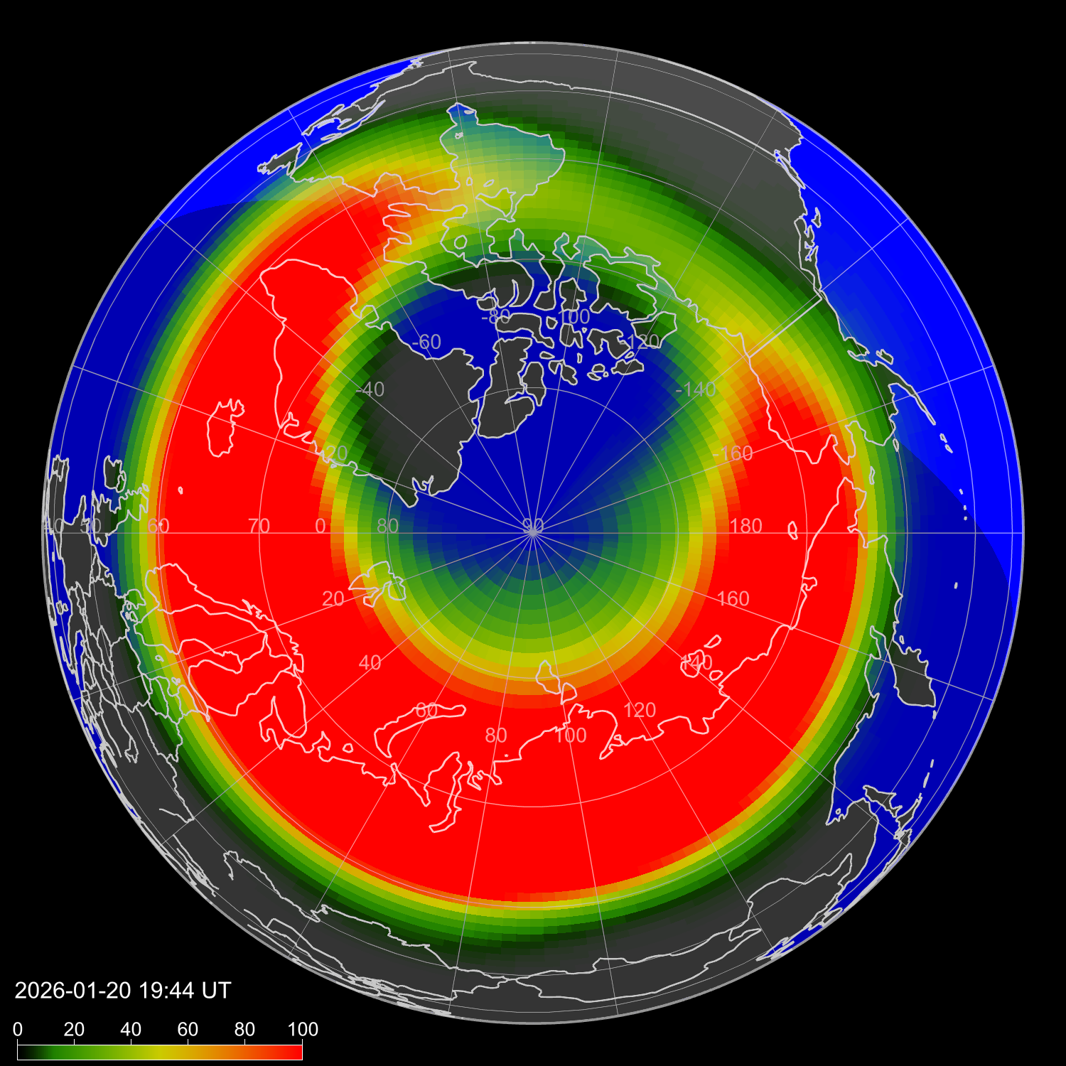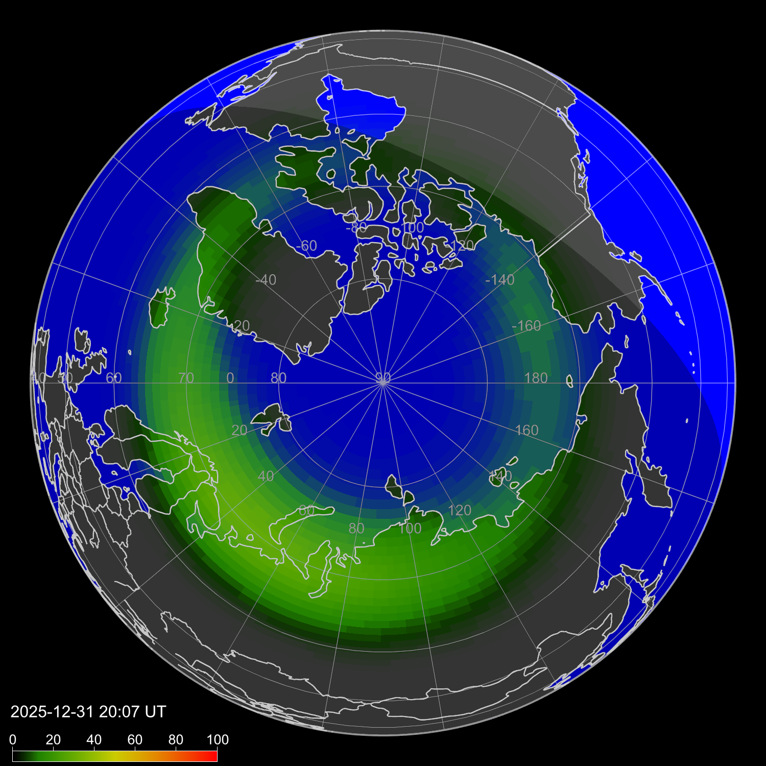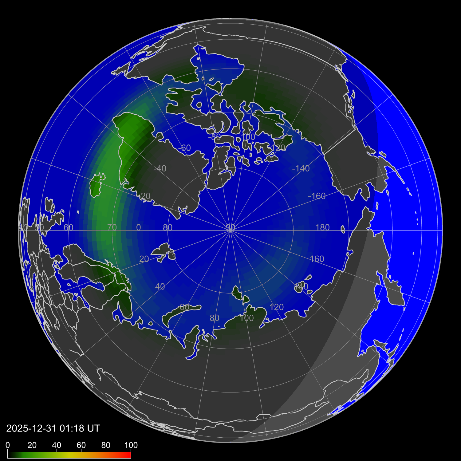 Индекс интенсивности полярных сияний и теоретически возможная широта наблюдений для ночного времени в западном полушарии