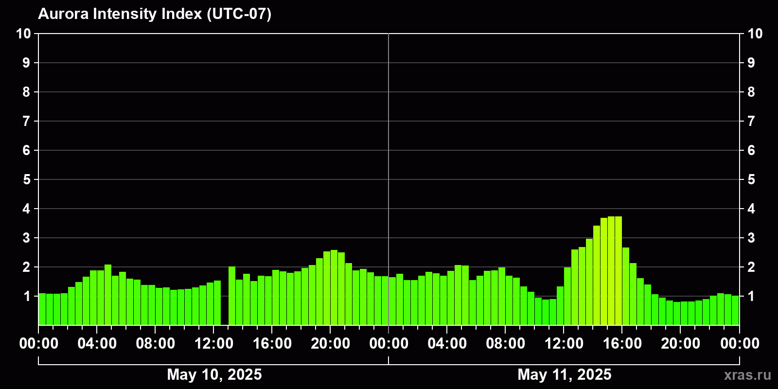 Changes in the auroral intensity index from 2025-05-10 to 2025-05-11 local time
