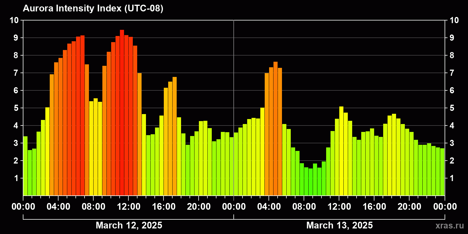 Changes in the auroral intensity index from 2025-03-12 to 2025-03-13 local time