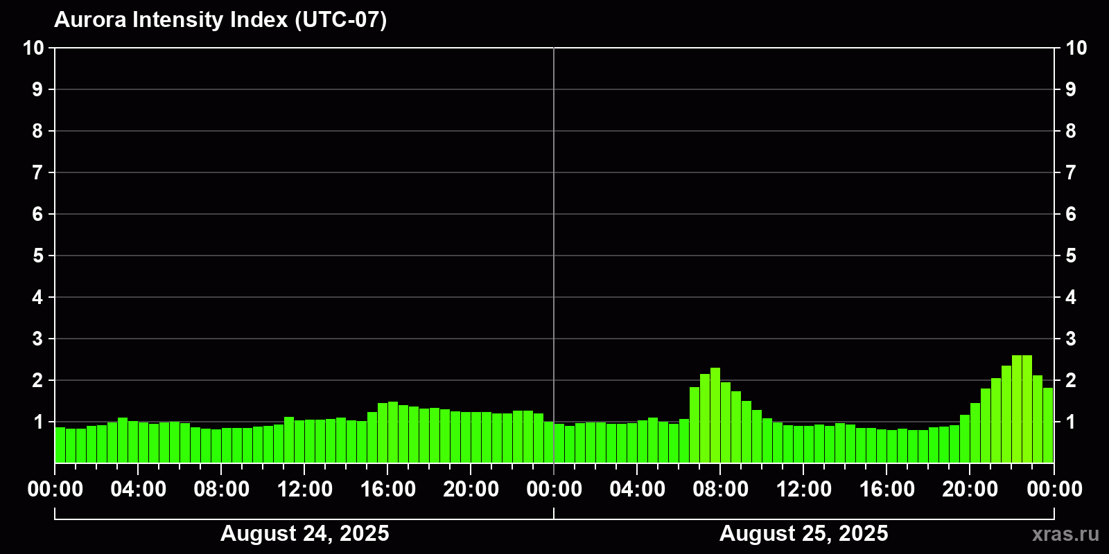Changes in the auroral intensity index from 2025-08-24 to 2025-08-25 local time