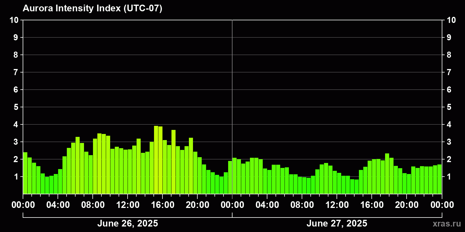 Changes in the auroral intensity index from 2025-06-26 to 2025-06-27 local time