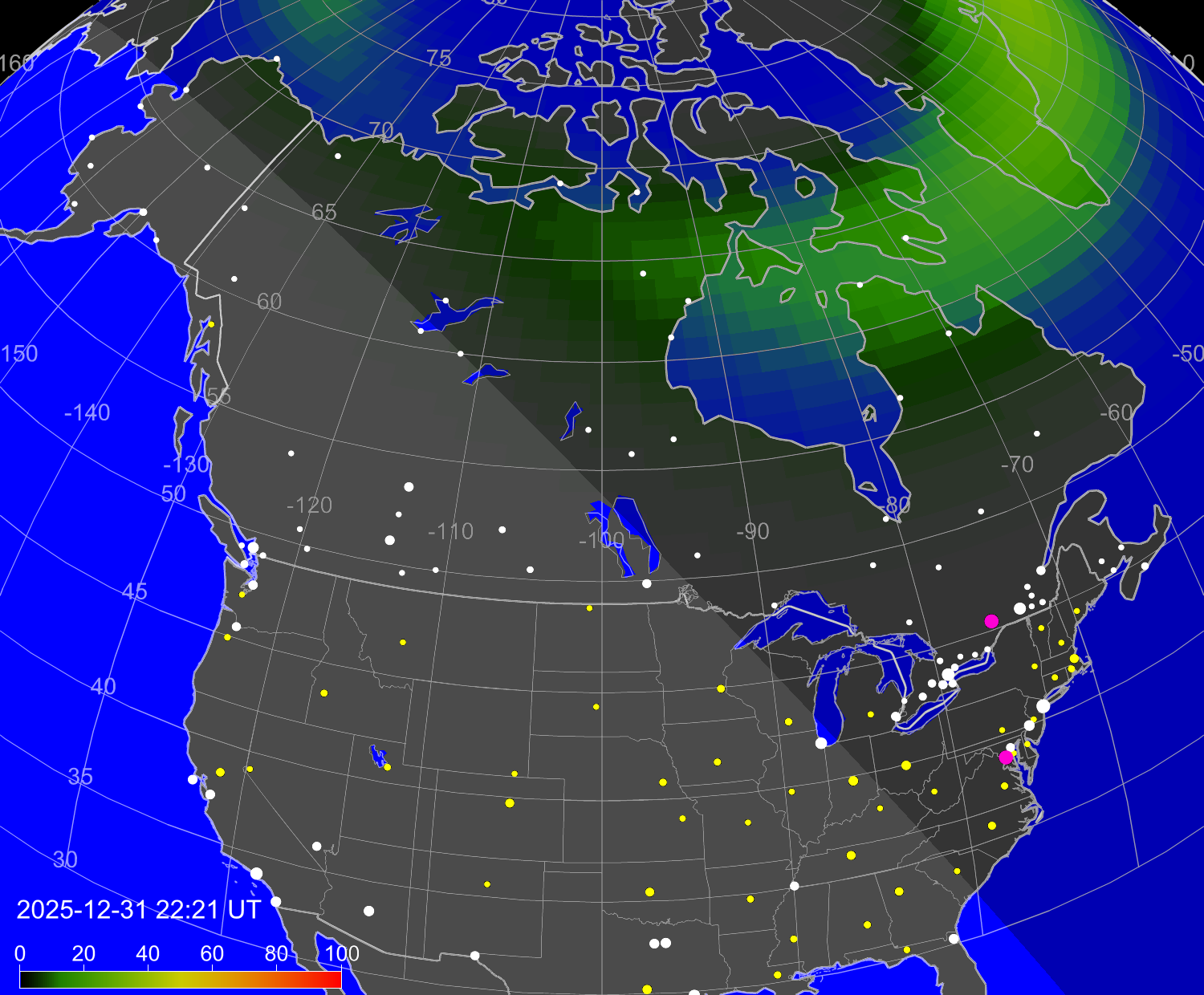 Вероятность полярных сияний в городах США