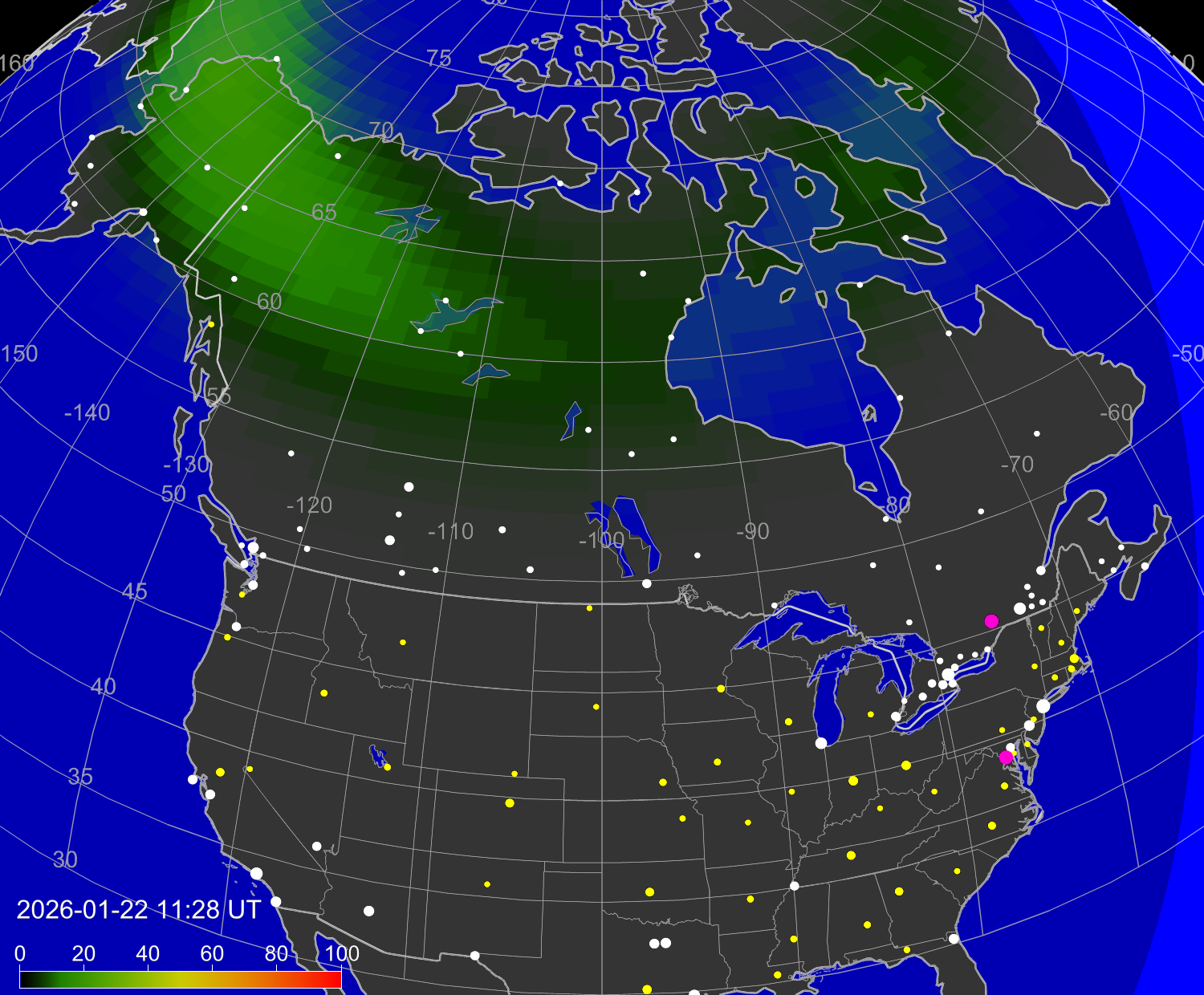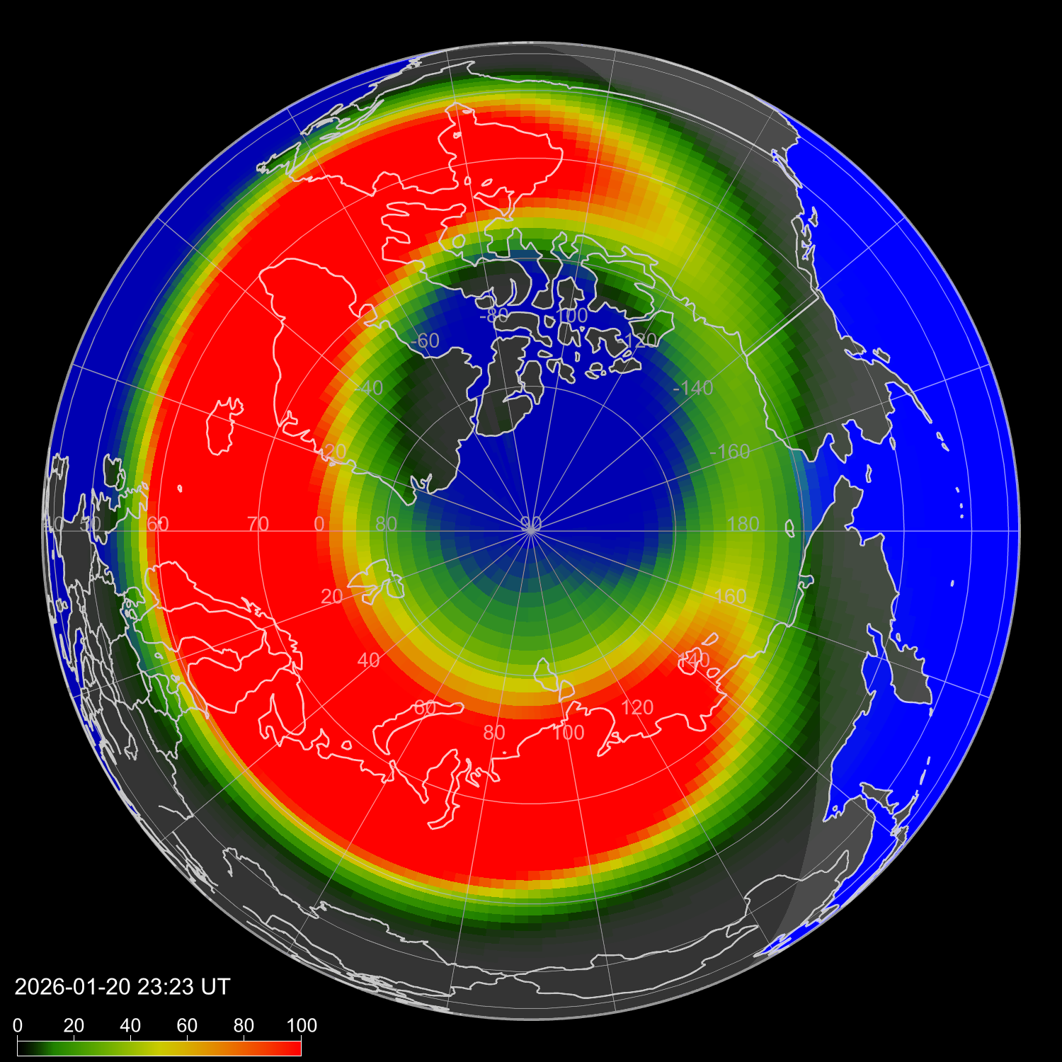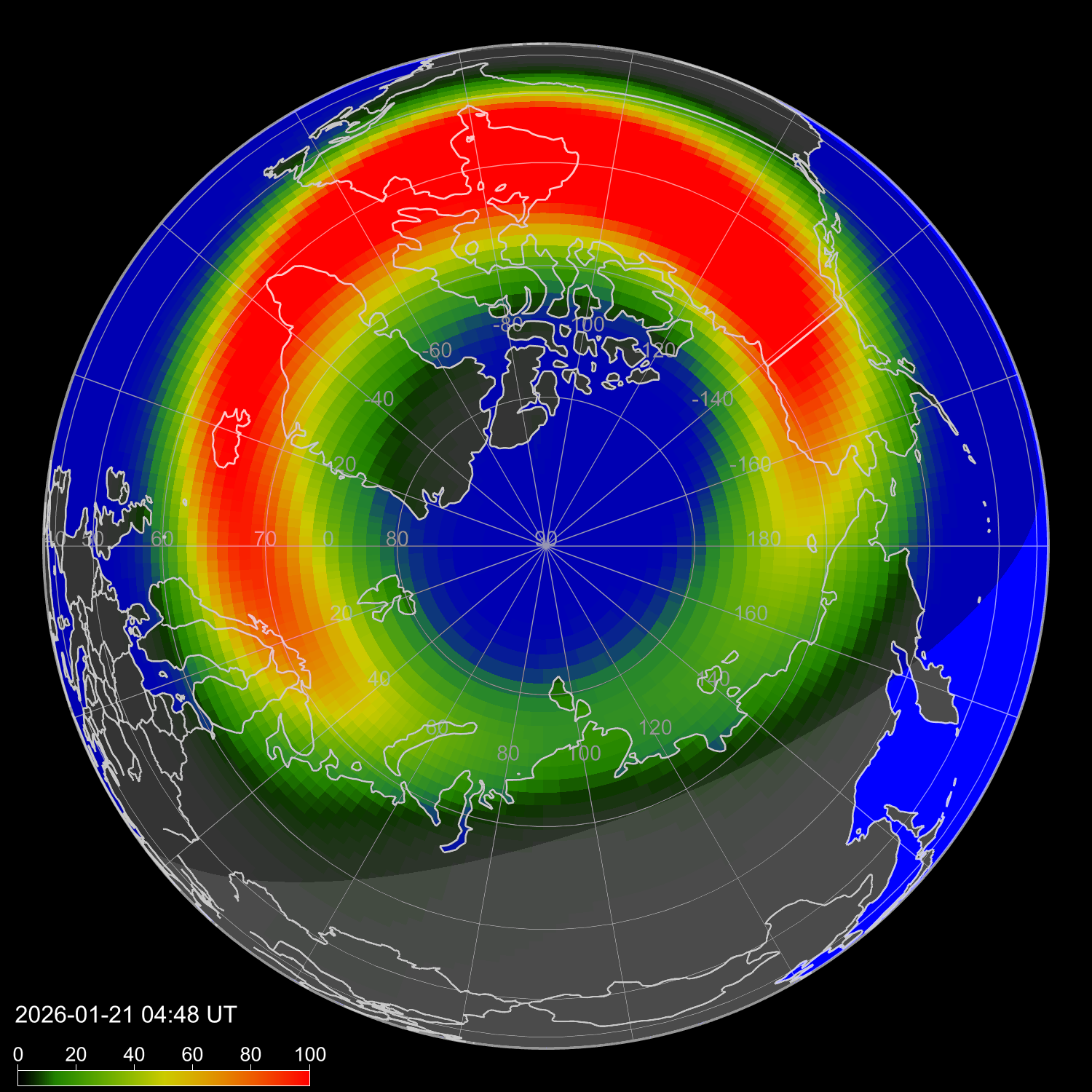 Индекс интенсивности полярных сияний и теоретически возможная широта наблюдений для ночного времени в западном полушарии