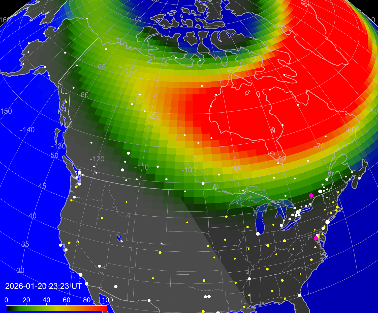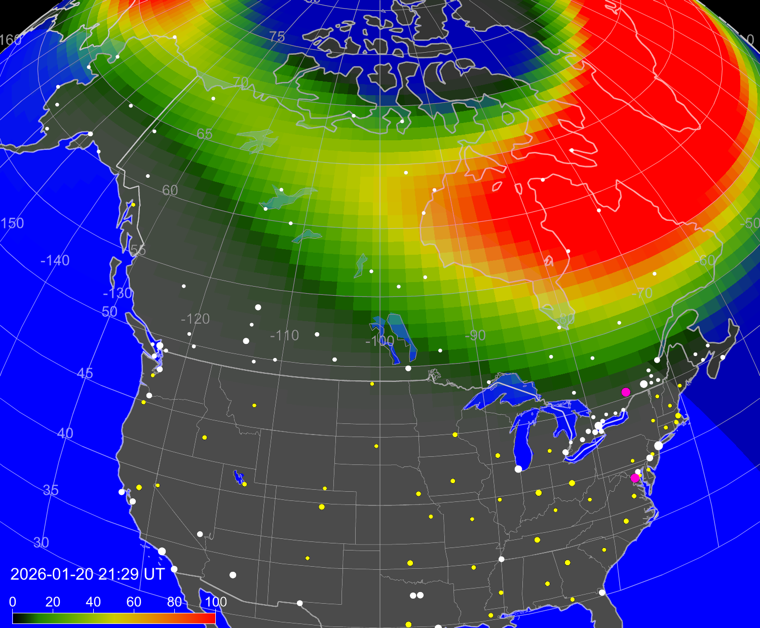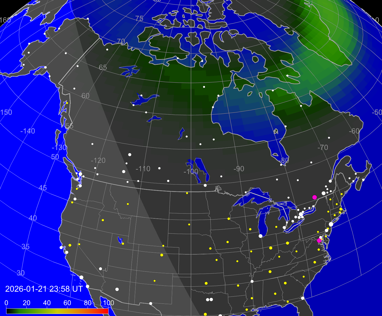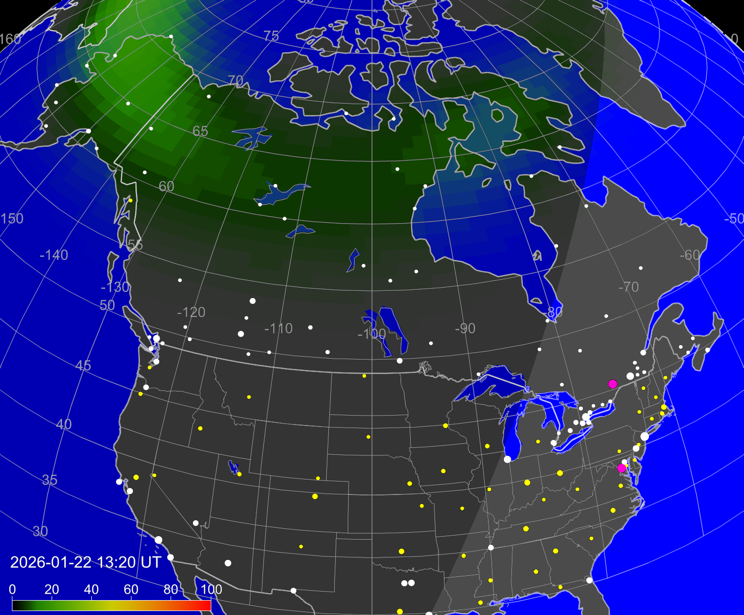 Индекс интенсивности полярных сияний и теоретически возможная широта наблюдений для ночного времени в западном полушарии
