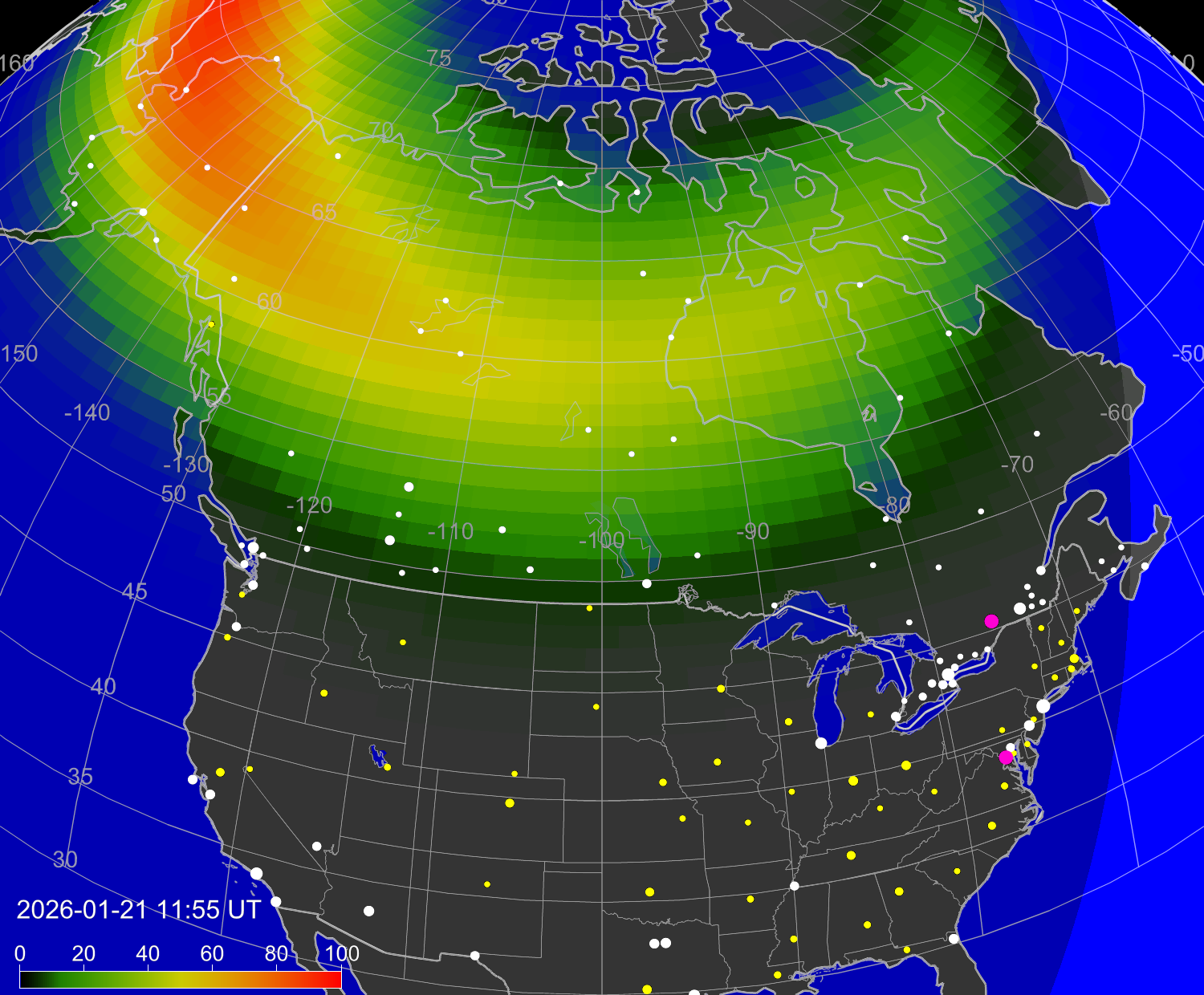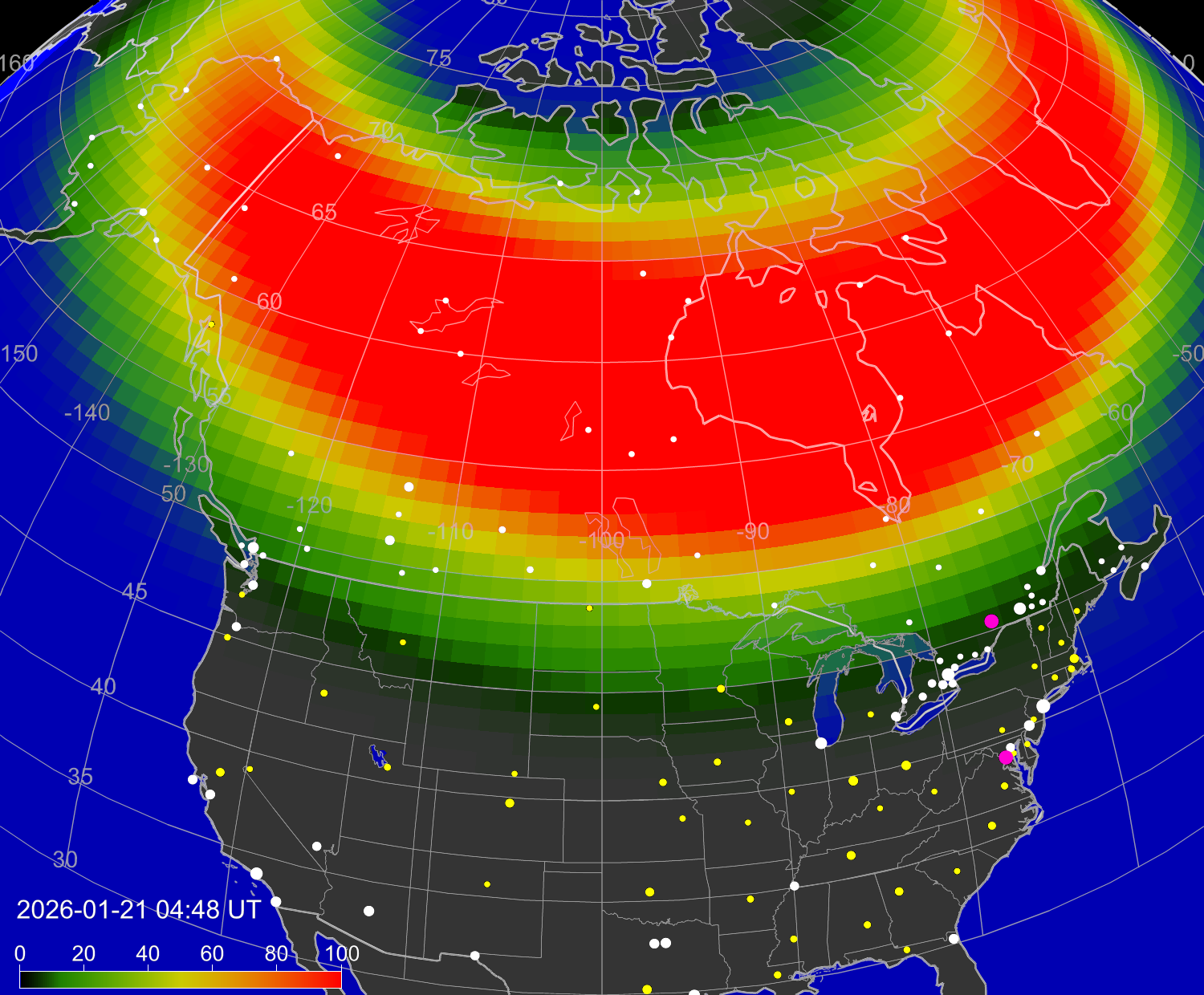 Изменения и часовой прогноз индекса интенсивности полярных сияний с 2026-01-21 по 2026-01-22