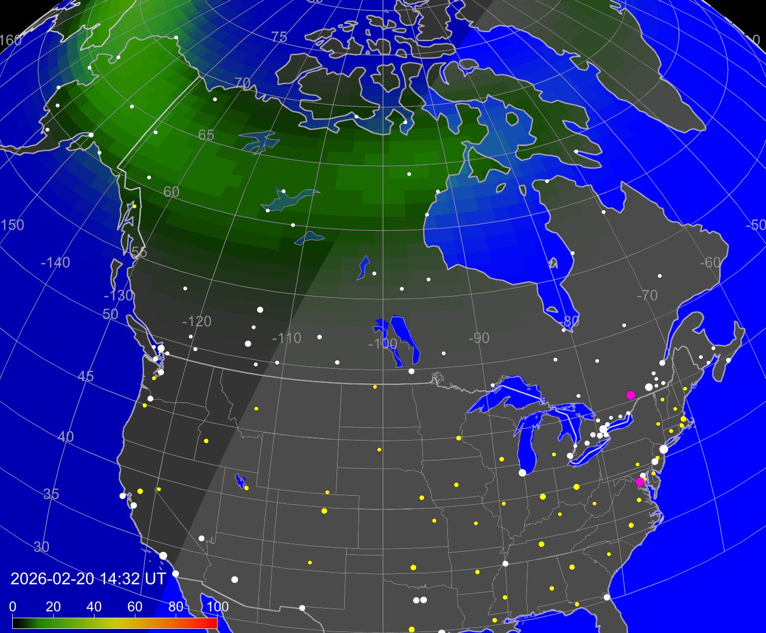 Изменения и часовой прогноз индекса интенсивности полярных сияний с 2026-02-18 по 2026-02-19