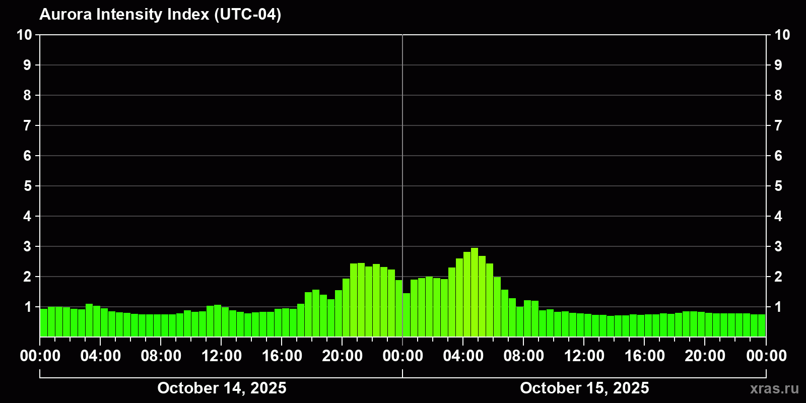 Changes in the auroral intensity index from 2025-10-14 to 2025-10-15 local time