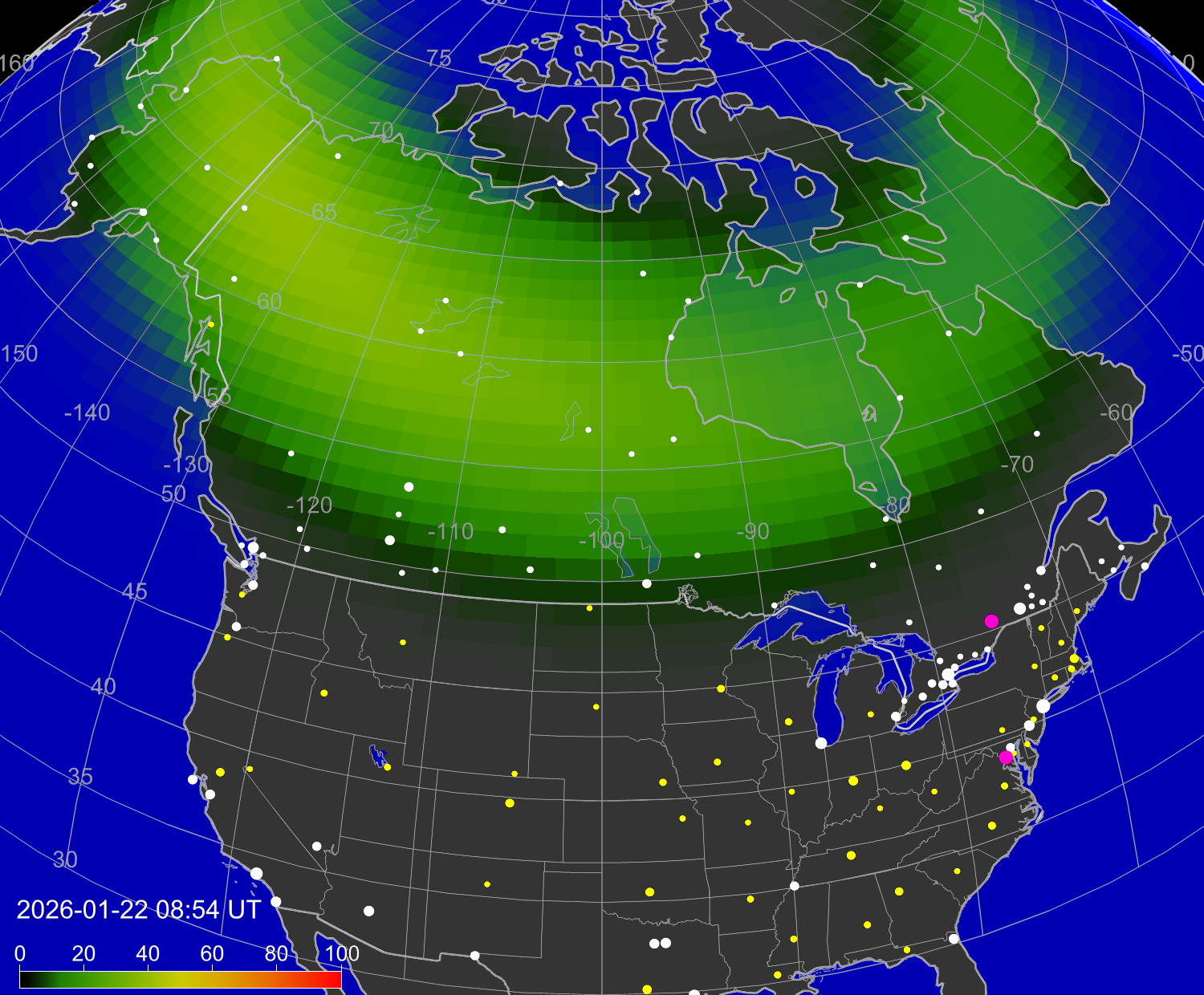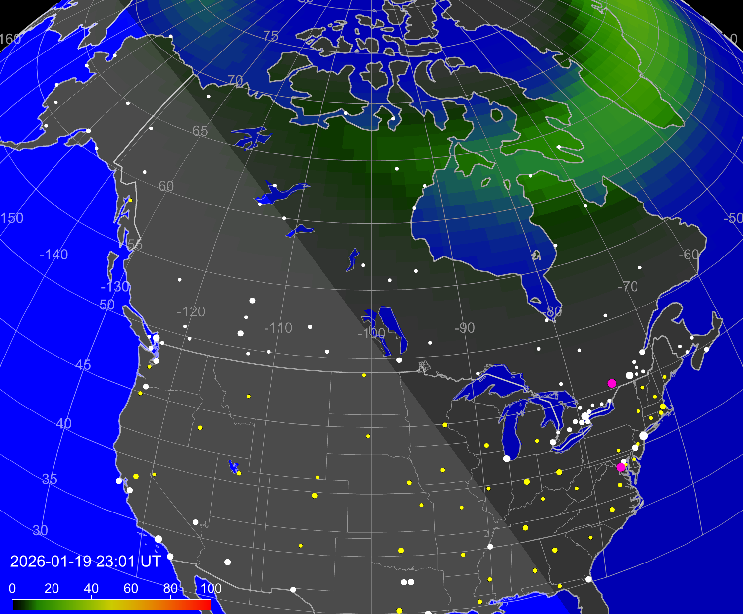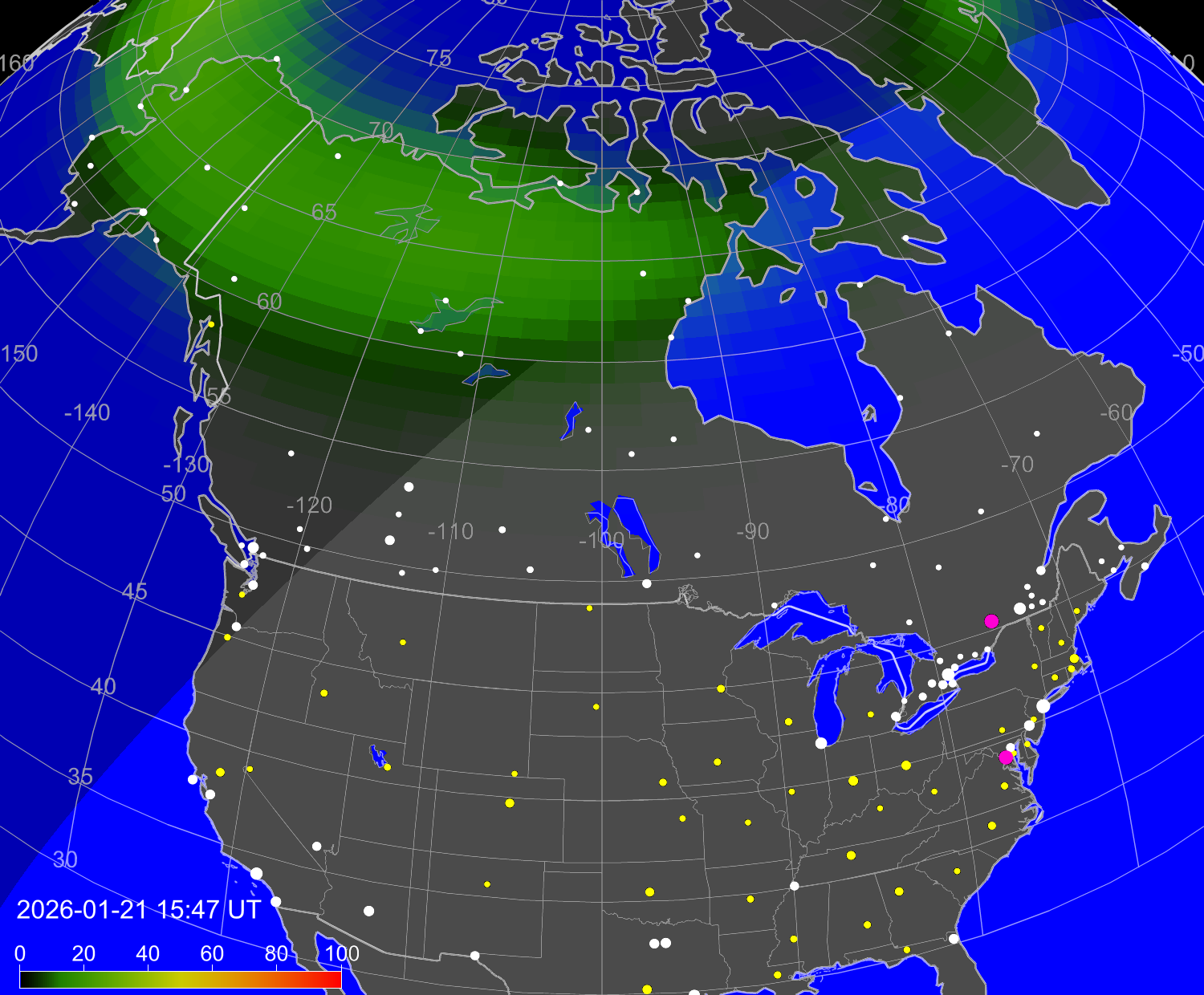 Вероятность полярных сияний в городах США