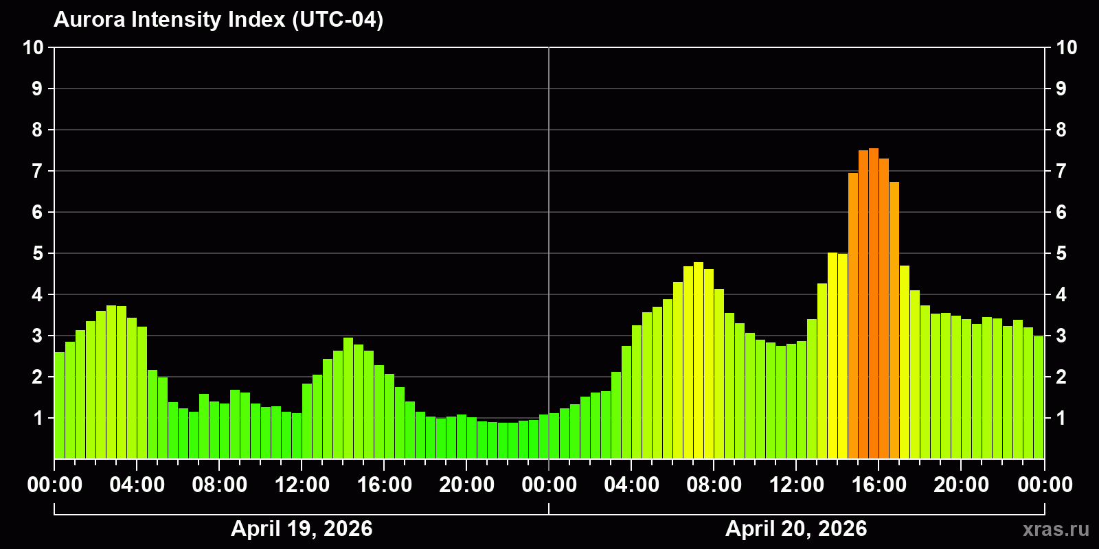 Auroral intensity index and the theoretically possible latitude of observations for nighttime in the Western Hemisphere as of 2026-04-20 23:51 (end of day) local time