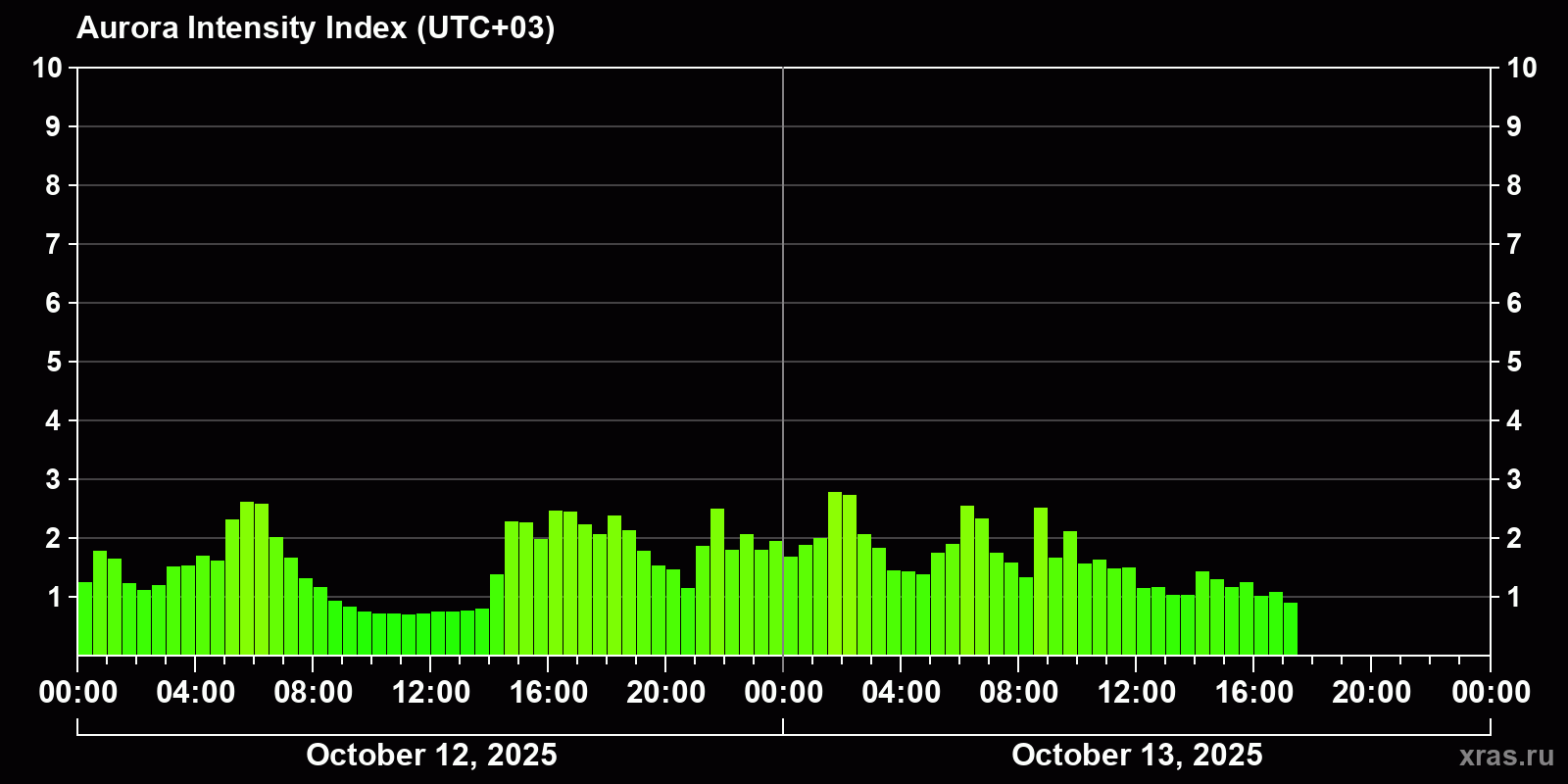 Изменения и часовой прогноз индекса интенсивности полярных сияний с 2025-10-09 по 2025-10-10