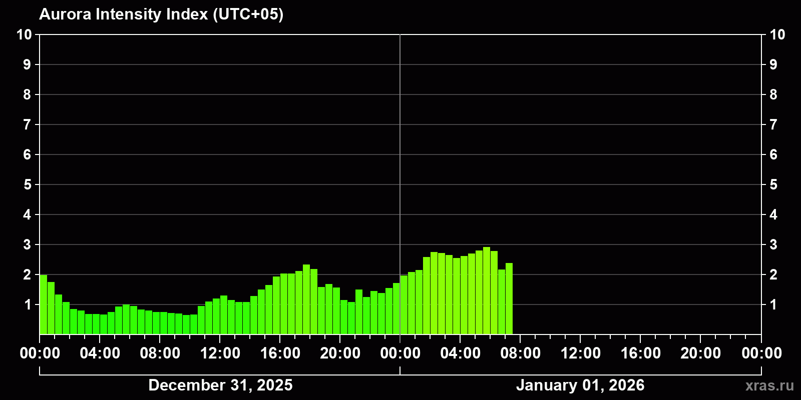Changes in the auroral intensity index from 2025-12-31 to 2026-01-01 local time