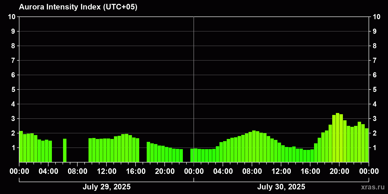 Auroral intensity index and the theoretically possible latitude of observations for nighttime in the Estern Hemisphere as of 2025-07-30 23:50 (end of day) local time