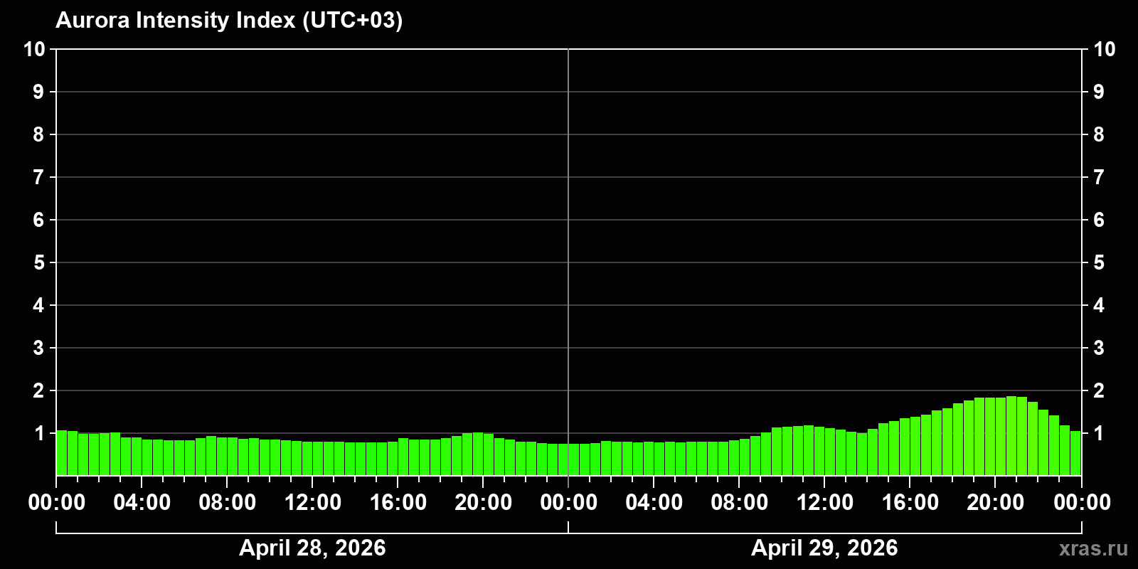 Changes in the auroral intensity index from 2026-04-28 to 2026-04-29 local time