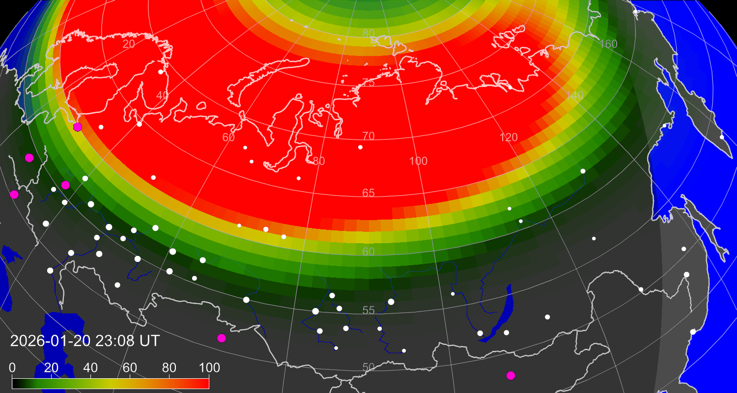Индекс интенсивности полярных сияний и теоретически возможная широта наблюдений для ночного времени в восточном полушарии