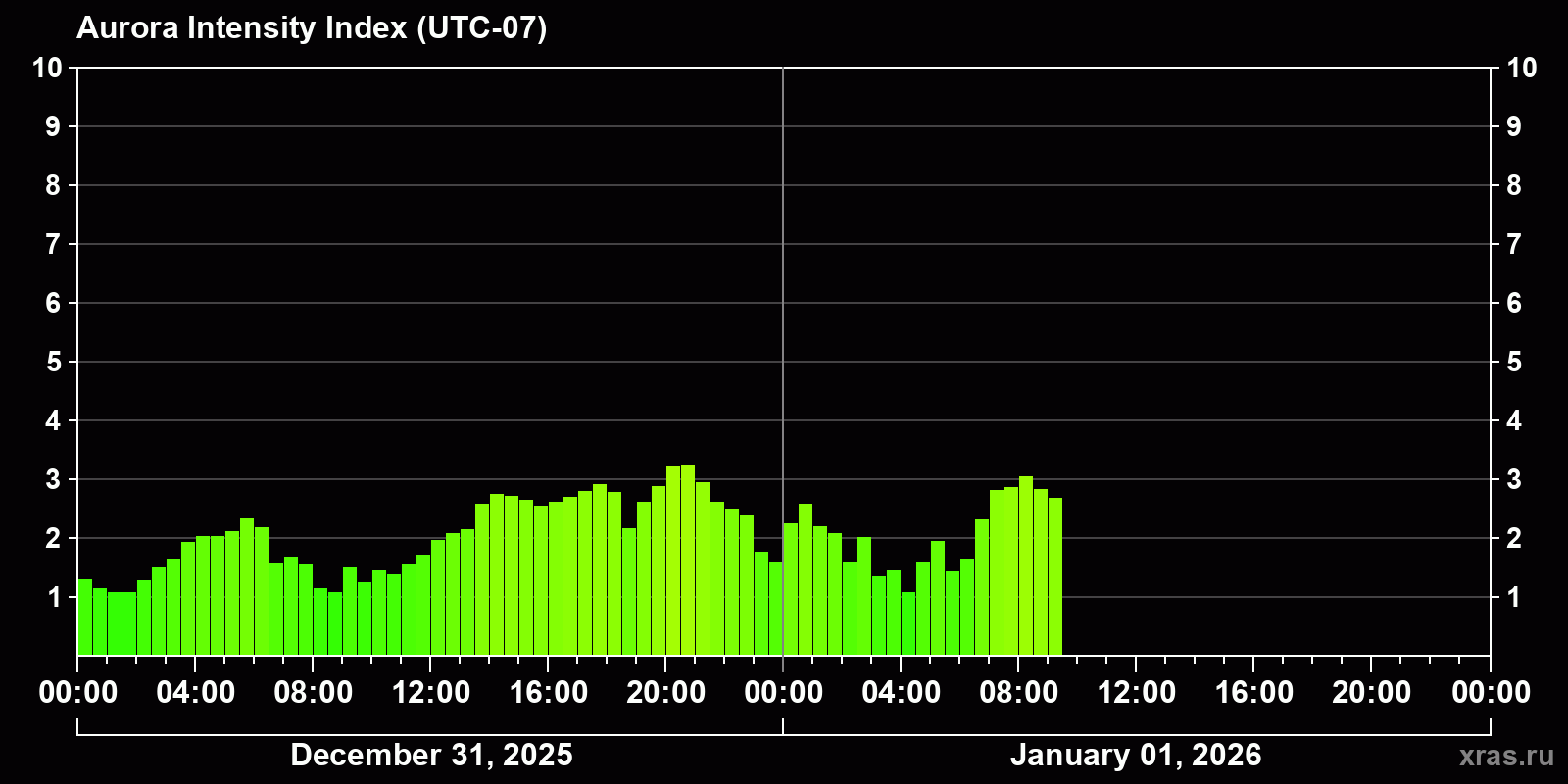 Auroral intensity index and the theoretically possible latitude of observations for nighttime in the Western Hemisphere as of 2026-01-01 07:06 (end of day) local time