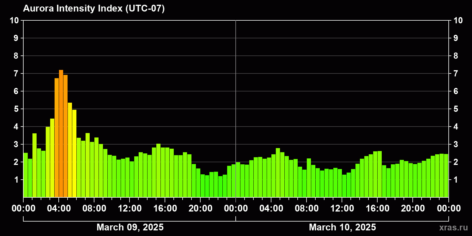 Auroral intensity index and the theoretically possible latitude of observations for nighttime in the Western Hemisphere as of 2025-03-10 23:51 (end of day) local time