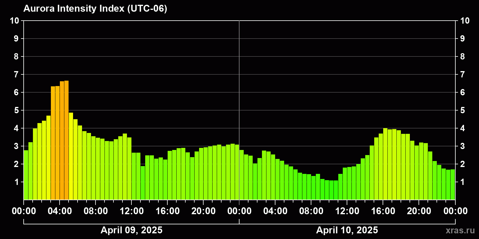 Auroral intensity index and the theoretically possible latitude of observations for nighttime in the Western Hemisphere as of 2025-04-10 23:51 (end of day) local time