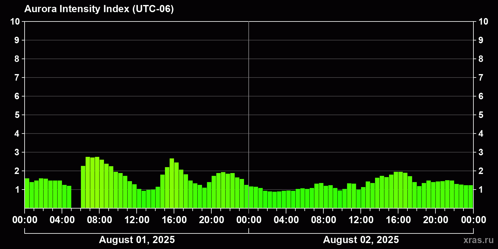 Changes in the auroral intensity index from 2025-08-01 to 2025-08-02 local time